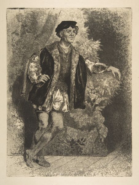 Félix Bracquemond created this etching titled ‘Portrait of Fernand’ in France. The print gives us an image of a man dressed in what might be a historical costume, leaning casually against what seems to be a garden wall. The etching technique renders the scene in great detail, with close attention paid to the textures of the costume and the foliage surrounding the figure. France in the 19th century was caught up in thinking about its own past, and how that past should be represented. The image doesn't seem to be a straightforward portrait of an actual person, but more like a study of costume, or even a theatrical character. The institutional context of art education in France at this time would have encouraged artists to copy historical styles and to think carefully about the relationship between past and present. Understanding this artwork fully means considering the artistic institutions and cultural values of 19th-century France, for which scholars might consult period publications and exhibition reviews. The meaning of the artwork lies in the way it engages with those contexts.
