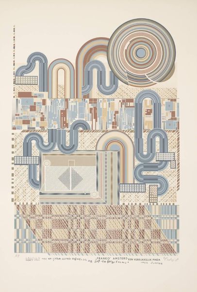 Curator: Immediately, I see a dense, almost overwhelming array of lines and shapes. It’s quite striking. Editor: We're looking at "Appel-Calder" by Sir Eduardo Paolozzi. The piece employs many layers of screenprint to create this visual experience. Curator: Screenprinting, yes. It feels almost like a blueprint or some kind of circuit board, hinting at technology and its structures. The way Paolozzi worked with repetitive forms makes me think about mass production. Editor: Paolozzi challenged the divide between high art and the everyday, using the language of mass media to reflect on post-war society. This piece does remind us how technology and consumerism shape our identities. Curator: Precisely. There's a critical commentary embedded in the work, it seems to suggest the way we navigate the modern world. He definitely questions societal norms. Editor: I appreciate that Paolozzi invites us to consider the physical process of image-making, making us wonder about the cultural implications. Curator: Agreed. The multiple layers reveal something of our own complex layers of identity.
