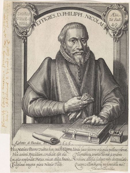 Petrus Clouwet created this portrait of Hendrik Zoesius as an engraving, a printmaking technique using fine lines to create a detailed image. The composition is carefully structured around the sitter, who occupies the center, framed by a backdrop of books and draped fabric. Look how Clouwet used the linear quality of engraving to define textures, from the ruffles of the collar to the patterns in Zoesius's robe. This is achieved through dense networks of lines, hatching and cross-hatching, creating a contrast between light and shadow that defines form. The formal elements of the portrait—the precise lines, the considered arrangement of objects, and the textual inscriptions—reveal a preoccupation with representation and identity. The portrait’s lines and forms communicate power and knowledge while revealing Zoesius's status and intellectual character. Notice how the detailed lines of the engraving serve not just to depict but to construct meaning, a testament to the power of form in conveying cultural and philosophical ideas.
