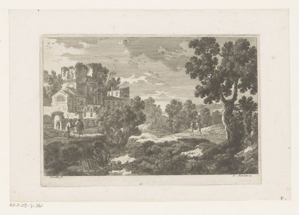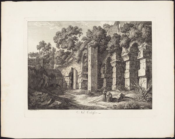 Curator: This delicate print captures the essence of Johann Christian Reinhart's neoclassicism. Created in 1798, it’s entitled "Avanzi della Bibliotheca in Villa Adriana," depicting the ruins of the library at Hadrian's Villa. Editor: It's melancholy, isn’t it? Ruins always feel that way to me – beautiful decay, like nature reclaiming what we thought was permanent. Curator: Absolutely. The crumbling architecture juxtaposed with the lush, enveloping landscape speaks to the ephemeral nature of human ambition, a key theme within neoclassicism, which sought to revisit grand, lost eras. This is etching and engraving at its finest. Consider, though, the implications of ‘ruin’ itself – a marker not just of lost glory, but of the societal structures that created it. Editor: It’s interesting that Reinhart focused on this angle of the ruins, though. Notice the lone figures down below near the treeline – dwarfed, completely. Maybe he's thinking about how tiny we all are against time's grand sweep? Gives you this peculiar sensation, a sort of melancholic wonder, don't you think? Curator: Yes, that diminutive human presence truly reinforces the work's overarching themes of mortality and impermanence, particularly in relation to empires and systems of knowledge. His composition leads your eye carefully around the scene. Consider the contrast between the wildness of the overgrowth and the formal Roman structure that peaks from beneath it. Editor: The wildness of the vegetation and how it intertwines! It reminds me of those hidden grottos where time ceases to exist – you can almost hear the rustling leaves, feel the damp stone…I want to walk in there and unearth ancient truths and then write a book about it. Or a song! It all feels so pregnant with forgotten meanings, don’t you agree? Curator: Very much so. And beyond aesthetics, it opens paths into exploring power structures reflected in its construction, loss, and rediscovery. In essence, it encapsulates a visual conversation between history, nature, and human existence, which prompts important questions concerning societal growth, dissolution, and the narratives that are preserved or eradicated over time. Editor: Reinhart invites a powerful feeling. You can hear history breathing down your neck…makes you want to listen to its whisper. It’s beautiful, profound, and kind of haunted all at once.