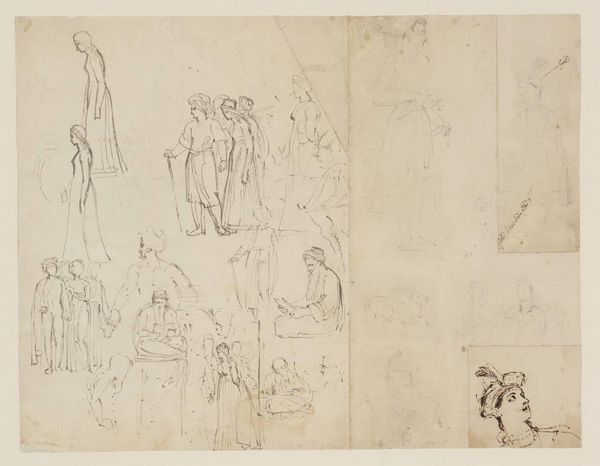 Curator: This is John Singer Sargent’s “Figure Studies of Horses, Children, and Women,” part of the collection here at the Harvard Art Museums. Editor: There’s an immediacy to this work. It’s like we're peering into the artist's sketchbook, seeing his raw, unfiltered thoughts take shape. Curator: Indeed. Sargent, known for his society portraits, often used sketches like these to explore form and composition. Note how his elite clientele and their accouterments are absent here, replaced by the mundane. Editor: The sketchiness speaks volumes about process. You see the artist grappling with line and form, focusing on the materiality of representation itself rather than polished illusionism. It foregrounds the labor. Curator: And it humanizes Sargent, doesn’t it? We see the artist working through ideas, unburdened by the expectations of the art market, allowing the drawings to reveal the artist's intimate process. Editor: Right, it’s a privileged view, disrupting the myth of effortless artistic genius by showing us the workings of art. These images show us how he made his art in the era's artistic and material culture. Curator: Seeing Sargent's sketches really changes how I understand the man and his work. Editor: It’s a reminder that even masters like Sargent were, at their core, artisans wrestling with materials and ideas.