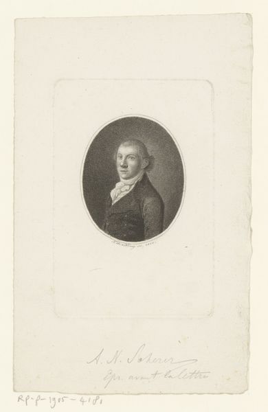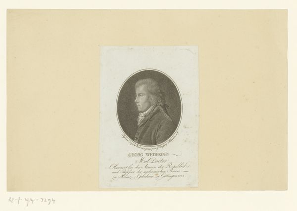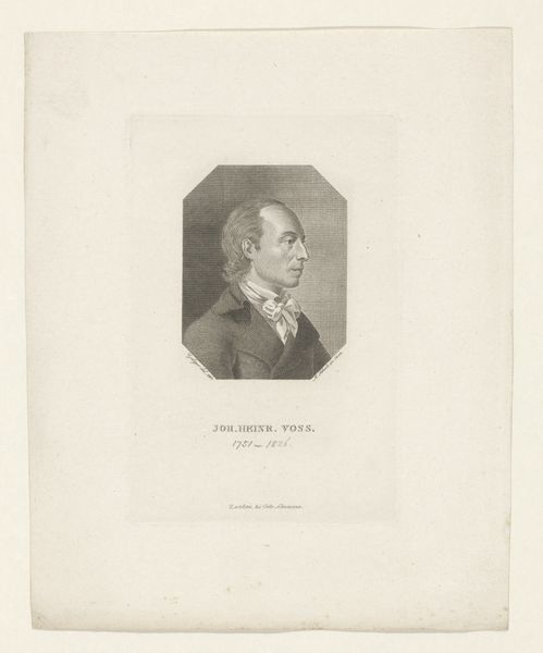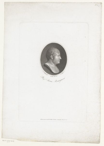 Curator: J.S.L. Halle gives us "Portret van Helene Charlotte von Friedland," an engraving dating possibly from 1803 to 1849, rendered in the neoclassical style. Editor: My immediate impression is of serene detachment. The oval composition lends a sort of framed stillness to her gaze. It feels meticulously planned. Curator: Indeed. Halle masterfully uses line and shadow to sculpt the form within the tight constraints of the oval. Notice how the clean contour isolates her features—the long nose, pursed lips—while the clothing has more textural detail, more variation. Editor: She seems presented to us not so much as a person, but as a type, perhaps the stoic intellectual or noblewoman. The averted gaze, the simplicity of her dress, her rather severe hairstyle… these seem loaded with encoded cultural messages. What class anxieties might this reflect? Curator: Intriguing question! Visually, the artist focuses the line and stippling to enhance tonal gradation, producing subtle shifts from the pure white paper to near black values, specifically focusing on delineating her refined aristocratic status. Editor: I agree. The symbolic language of class is clear. But consider the larger frame. The empty space surrounding the image emphasizes her isolation, potentially a symbol for loneliness or a specific psychological attribute ascribed to aristocratic women during that era. Curator: That negative space definitely amplifies her presence and the image's monumentality; although print media can easily lend themselves to notions of the reproducible image, the fine line work makes this image feel carefully crafted and individual. Editor: Looking at this piece again through the lens of iconography, the figure reminds us how carefully constructed identities have always been; she shows us the performance of social roles that create an overall lasting image and idea of nobility. Curator: A powerful synthesis! Studying Halle’s neoclassical techniques, along with understanding historical context and representational strategies of nobility, yields more insightful ideas to ponder about this composition. Editor: Ultimately, I see this print as not only a portrait of a person, but also a symbol of an entire cultural era's ideals.