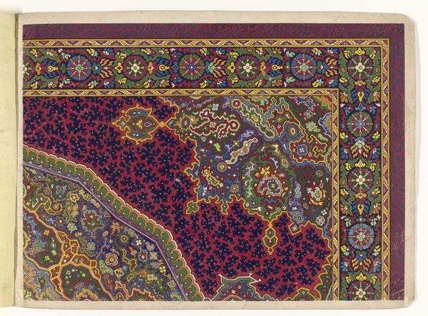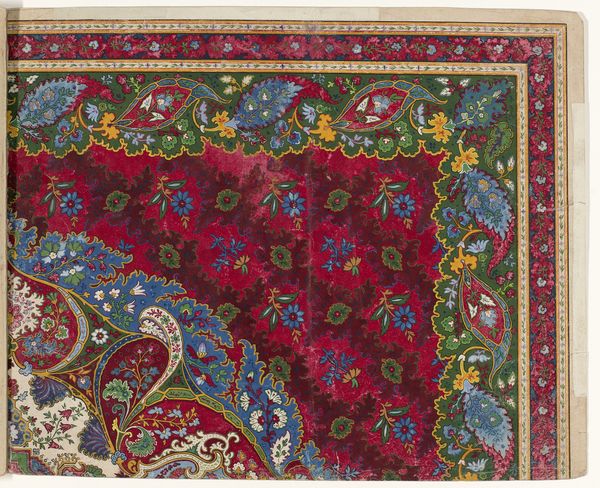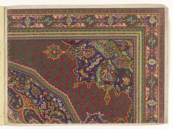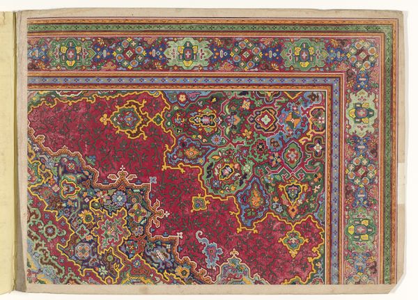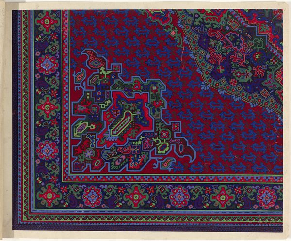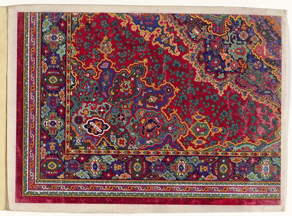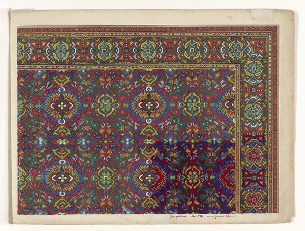 This is a design for a carpet, rendered anonymously in watercolor and pencil, likely intended for production at a later stage. Carpet design, especially in regions like Persia, was deeply intertwined with cultural identity and social status. The intricate patterns and vibrant colors you see here, are not merely decorative; they are visual codes. We can understand the cultural references and historical associations through archival research into the economic structures of the time, for instance. The design features a complex interplay of geometric and floral motifs, common in Islamic art, which reflect a culture deeply rooted in mathematical precision and an appreciation for the natural world. The carpet itself served not only as a functional item but also as a symbol of wealth and taste. To fully grasp the design’s significance, we need to consult historical records and explore the social conditions that shaped its creation. This will enhance our understanding of its place in the history of art and culture.