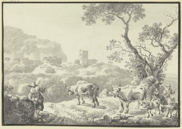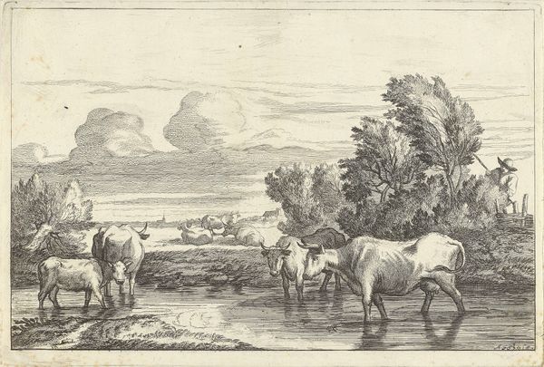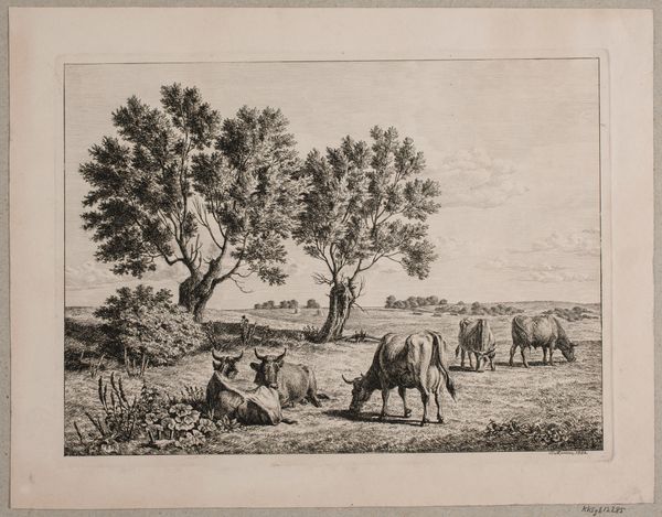Curator: Welcome. We’re standing before A.P. Madsen's "Landskab med græssende kvæg," which translates to "Landscape with Grazing Cattle," created in 1856. It’s an engraving, offering a glimpse into 19th-century Danish pastoral life. Editor: The composition immediately strikes me as very calm and somewhat… melancholy? The cows seem listless, and the trees, though large, appear a bit burdened, with droopy, full canopies. The entire scene is rendered in such delicate lines, reinforcing the stillness. Curator: Yes, the stillness you mention comes from the precision inherent in the engraving process. Madsen meticulously etched lines into a metal plate; those lines hold the ink and then transfer onto paper. Each mark represents hours of skilled labor. Think about the societal view of agricultural labor and leisure—the pastoral idealized—which of course, glosses over harsh realities. Editor: Absolutely, and this engraving reflects that glossing over. There's a powerful social narrative embedded in representing these animals in this very picturesque setting. I wonder about Madsen’s intention in emphasizing the peace, perhaps offering a vision of stability during a time of social change and industrial growth. Whose land were they on and how did the community feel about them? The absence of humans begs further inquiry, as it reinforces their exclusion from what appears to be "natural." Curator: Consider the economics as well. An engraving like this wasn't for the peasant farmer, but more likely, an object of aesthetic consumption for the rising middle class. It connects to broader questions about land ownership, the commodification of rural imagery, and access to visual representations of "nature". The landscape becomes a symbol, divorced from the actual toil and environmental impact. Editor: It reminds us that even seemingly benign landscapes are loaded with ideology and socio-political messaging. The cows are simultaneously docile agricultural tools as well as elements contributing to an emotional and aesthetically calming image. What we deem beautiful—particularly within a rural context—often conceals complicated issues of labor, class, and environmental implications. Curator: Right, we must look past what may simply strike the viewer as pleasing scenery, and recognize it as a crafted construction, steeped in materials, labor, and social values. I've never really looked at it from your perspective before, I must admit. Editor: Similarly, I never realized the extent to which a single engraving carries such a weight of physical making. It is another reminder of how we, as beings influenced by context and time, are viewing that which has long existed before our eyes.