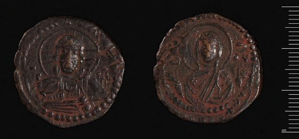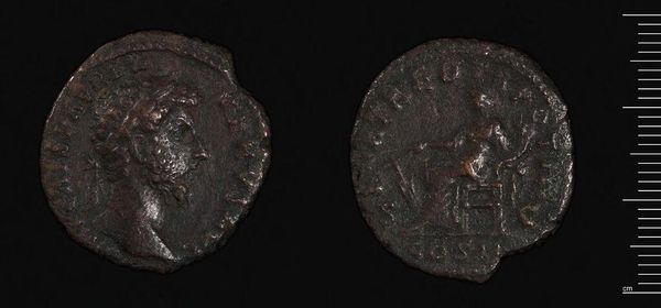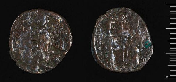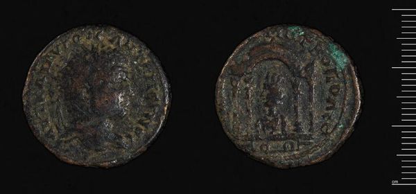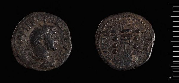 Curator: Here we have a coin of Zeugma, minted during the reign of Philip I, the Arab. Its weight is 15.23 grams. Editor: It feels weighty, doesn't it? The image is worn, but the central structure still conveys a sense of austere power. Curator: Indeed. Note how the composition uses the circular form to create a self-contained world. The dense texture further emphasizes the object’s materiality. Editor: That temple-like structure must have held significant cultural importance. Its appearance on the coin suggests an intention to associate Philip’s reign with a powerful religious symbol. Curator: Precisely. And the rigid lines of the architecture contrast beautifully with the softer rendering of the Emperor’s portrait. Editor: The coin is a microcosm of cultural values and imperial ambition—a window into the symbolic language of power. It speaks volumes. Curator: A compelling demonstration of how form and function intertwine to create meaning. Editor: Absolutely, seeing the symbols and interpreting their meanings is a really lovely part of studying such an object.