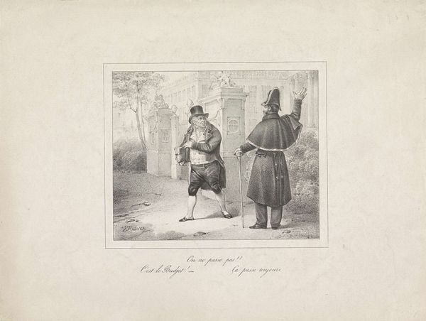 Curator: This print, created in 1829 by Jean-Louis Van Hemelryck, is titled "Koning Willem I ontmoet een stroper," which translates to "King William I meets a poacher." The work is an etching, falling into both portrait and genre-painting categories. Editor: There's something instantly striking about it; the rough landscape looming in the background makes the figures in the foreground seem almost like actors on a stage. It feels heavy, and almost like a theater of class and power. Curator: Absolutely. The visual language positions the King in stark contrast to the poacher. The King, on the left, is dressed in sophisticated dark coat and hat, his hands respectfully tucked into his side. He emanates authority. Editor: And that poacher! He's pointing towards something with real fervor; or maybe a wild frustration, as his entire attire seems rugged. The scene implies an exchange, perhaps even a confrontation. Look at his expression versus the King’s subtly smug face. What power! Curator: The artist captures a fascinating intersection of class and legality, the narrative artfully displayed through clothing, body language, and the positioning of figures. His gestures are theatrical—like an invitation into his outlawed world. Editor: The figures feel like characters extracted from a play, a comedy maybe or some social drama; there's even writing beneath the art that confirms this. And yet there’s such detail in the scene. The wild landscape looms above them! Curator: Consider how Van Hemelryck uses printmaking here. Each fine line constructs not just physical likeness, but also complex emotional and social dynamics—rendering visible the tensions brewing within the society it depicts. What does this imagery tell us about that world and time? Editor: It really is captivating. It pulls you in, demanding a closer inspection not only of the lines on the page, but also of the unseen stories simmering just beneath the surface. I like how something as fragile as a paper and an etching tool becomes so alive and engaging. Curator: It provides us, certainly, much to reflect on about social hierarchy, the rules of nature, and human interaction. Editor: Indeed. What starts out appearing as simple art actually opens itself up to wider ideas about history. It's not only visually remarkable; the etching asks viewers to engage the historical circumstances that it attempts to reflect on, too.