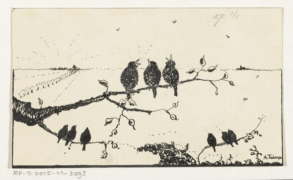 Curator: This engraving, crafted before 1892 by de Groot, is titled “Vijf kaketoes zittend op een boomtak”—“Five Cockatoos Sitting on a Branch.” Editor: Ah, a flock of feathered philosophers, it seems. There’s something rather melancholic about this grouping—they're huddling together as though warding off a chill, maybe even a deep existential dread. The texture gives it this quality; they appear almost vulnerable in their detailed rendering. Curator: The cross-hatching gives the piece such incredible depth! You can practically feel the roughness of the branch they perch upon. And consider the implications of depicting cockatoos – a species so often commodified and caged – in the context of late 19th-century colonialism and the exoticization of the "other." Editor: That’s a strong point. These aren't simply birds; they become potent symbols of displacement, alienation, and the disruption of natural habitats, even though the branch gives a strong grounding and safety from being too exposed to the outside environment. Are they aware of it, are they happy with it, or not. The choice of a seemingly objective realistic style doesn’t obscure these interpretations. The piece also feels unfinished in a way— intentionally or unintentionally making it that much more contemplative. It lacks some details of completion, just the way colonial times felt to natives, and still do. Curator: It almost seems like Groot invites us to consider these birds’ own perspectives on their surroundings – if indeed they’re still “surroundings” and not enclosures by the time this drawing comes to be. This piece makes you feel a certain disquiet – a discomfort in observing that shifts our perception towards something bigger. We go from simply seeing a drawing to questioning the reality. Editor: And, there's this palpable sense of collective consciousness – they share something. As birds that travel in a flock, you feel this communal sense of responsibility as one body on one shared goal. The way de Groot depicts this consciousness speaks of so much pain, that translates to their displacement during those periods in time. Their feathers feel a certain darkness about it as if reflecting this internal trauma. It’s beautiful, even painful, that you get the emotions of collective consciousness here through what is depicted in this drawing. Curator: This work reminds us to see the world not just from our human viewpoint, but through the experiences of creatures whose lives are deeply entwined with our own histories. Thank you. Editor: A sobering thought, rendered with surprising intimacy and tenderness. The silence these birds invite is actually screaming at a deep existential trauma. Something very haunting lingers there.