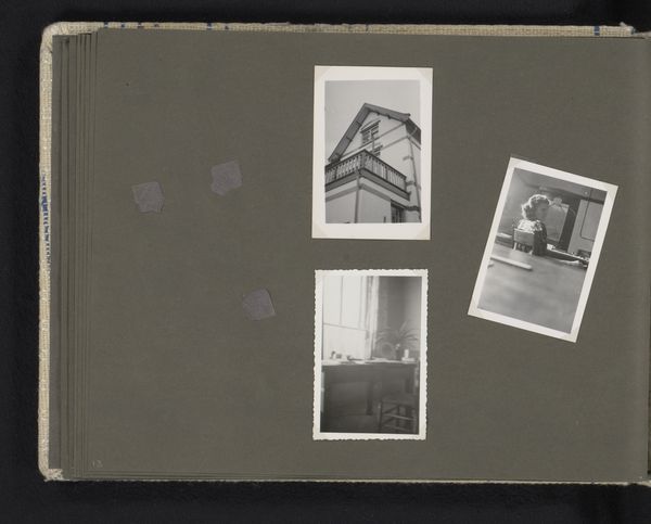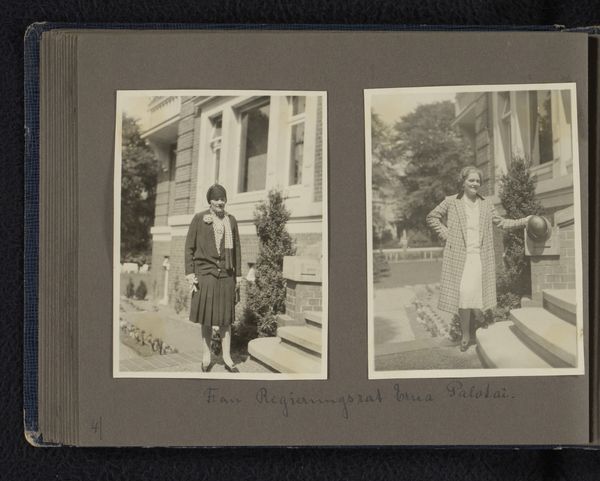 Curator: This gelatin-silver print, dating from around 1930, is titled "Portret van Herman Besselaar met een boek in de hand en een portret van Berti Hoppe op straat," which translates to "Portrait of Herman Besselaar with a book in his hand and a portrait of Berti Hoppe on the street." It's a rather fascinating combination, wouldn’t you agree? Editor: Absolutely. My initial impression is one of striking contrasts. There's this intimate, book-lined study on the left, evoking intellect and perhaps privilege, versus the outdoor scene—the lone woman almost swallowed by the bleak, public space. What kind of statement is being made by pairing these? Curator: Contextually, understanding Hoppe's position as a woman photographer in the early 20th century helps us read into it. This wasn't merely a physical separation of settings, but potentially symbolic of gendered access and artistic visibility. What institutional structures afforded Besselaar the comfort of his study, while Berti, potentially the artist herself, navigates the world? Editor: It really poses questions around space, both physical and intellectual. Did these individuals even occupy equal standing in the art world or society? Besselaar appears centered and almost self-assured in a conventional, domestic sphere, his portrait speaking volumes about expectations around masculine scholarly pursuits. Hoppe’s, by comparison, has this... vulnerability? Curator: Yes, but I wonder if that 'vulnerability' is an imposition of our contemporary gaze? We must remember to ask if Hoppe perceived herself as 'vulnerable' or, alternatively, bravely occupying space despite societal restrictions, her own presence in the outdoor photo functioning as a claim to visibility. What is it to claim agency through self-representation when your gender is so politicized? Editor: It makes me reconsider that ‘vulnerability’ as perhaps resilience or defiance then. There's a deliberate stillness in both images that could represent posed control over the representation, in line with portraiture practices of that time. How was Hoppe utilizing self portraiture in relationship to prevailing views? Curator: Precisely. Further institutional analysis reveals the politics around photography exhibited within artistic and even cultural platforms at this time; How did certain figures access spaces while others did not? The interplay is just fascinating; by juxtaposing Besselaar’s indoor portrait with Hoppe’s solitary image on the street, there is space for us to recognize her individual resilience as a practicing woman photographer. Editor: Exactly, it’s this tension that makes this such a potent piece. It becomes a powerful dialogue on artistic, gendered identity, framed, literally, on a single page. Curator: Yes, I will never look at such juxtaposition the same. Thanks to considering art from feminist perspective it really highlights structural elements on access to arts by gender.
