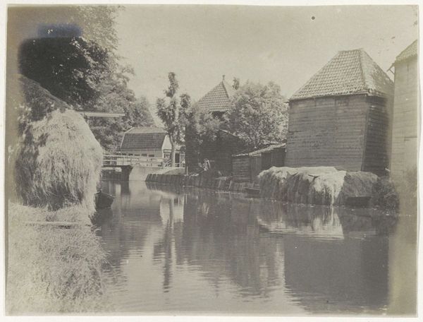 Editor: This is "Sloot achter de Lage Horn in Zaandam," a photograph from 1904 by James Higson. The sepia tones give it such a nostalgic feel. I’m struck by how the reflections in the water almost perfectly mirror the buildings, blurring the line between reality and image. What symbols do you see present in this work? Curator: The photograph presents several interesting symbols. Notice how the water, ever-present, reflects not just the physical buildings but perhaps a deeper, submerged history. The buildings themselves, seemingly emerging from the water, represent the human imposition upon the natural landscape. Consider the watery reflections and their implications – distorted yet recognizable, much like memory itself. Doesn't this duality evoke the passage of time and its impact on our perception? Editor: I see what you mean! It’s like the present is built upon a fluid, ever-changing past. Is the presence of water meant to show life or suggest something else entirely? Curator: Both, perhaps. Water, in many cultures, symbolizes purification and rebirth. Yet, it can also represent the unconscious, the unknown. The mirroring effect might indicate a collective yearning, or shared psychological imprint of a past reality, a world both present and fading. What do you make of the presence of people? Editor: It's very interesting you mention the figures in the image. It's not something I immediately noticed; however, upon further review, their attire implies cultural themes. Their inclusion invites curiosity for the everyday lived experience. Curator: Indeed. These snapshots invite us to reconstruct not only what was visually recorded but what meanings those visual records bear to modern audiences. Images can often act as a trigger. I do believe we could continue to speak about James Higson's capture of visuality within Zaandam and how water signifies themes. Editor: I learned so much about how seemingly simple images can contain layers of cultural memory and symbolism. Thank you!