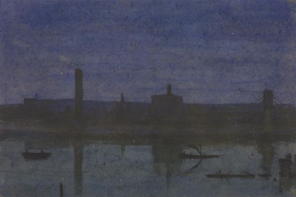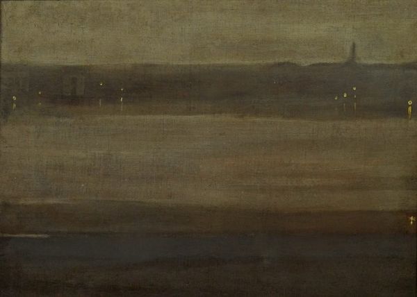 Editor: This is James Abbott McNeill Whistler's "Nocturne: Grey and Gold," painted in 1874 using oil paint. It evokes such a subdued, almost mournful feeling with its muted color palette. How do you interpret this work? Curator: This piece is interesting because it arrives in the context of rapid industrialization and urbanization in 19th-century London, reflecting a particular socio-political mood. The atmospheric effects – the smog, the diffused light – aren't just aesthetic choices. They become a commentary on the changing environment, perhaps even a critique. Do you see any parallels to current discussions on climate change? Editor: That’s interesting. I hadn't thought about the industrial context so directly, but now that you mention it, the greys seem less romantic and more…polluted. It makes me consider what Whistler wanted to highlight about London. Curator: Precisely! Consider the golden highlights as resistance, beauty found within an ugly reality. Also, keep in mind Whistler's emphasis on "art for art's sake". Is he detaching from direct political statements, or creating a new kind of engagement through emotion and sensation? What do you think? Editor: It feels like he's using the aesthetic to invite conversation. Like he’s saying something about modern life, but it’s subtle, not preachy. Curator: Exactly. And that subtlety is where its power lies, encouraging reflection and not necessarily demanding answers. Whistler blurs boundaries between the personal and political. This complicates the narrative. Editor: That makes sense. It’s less about the "what" and more about the "how" we experience it, which is also, inherently, a political position. Thanks, I am definitely thinking about it differently now! Curator: Absolutely. And by exploring these different layers of meaning, we enrich our understanding of the artwork.