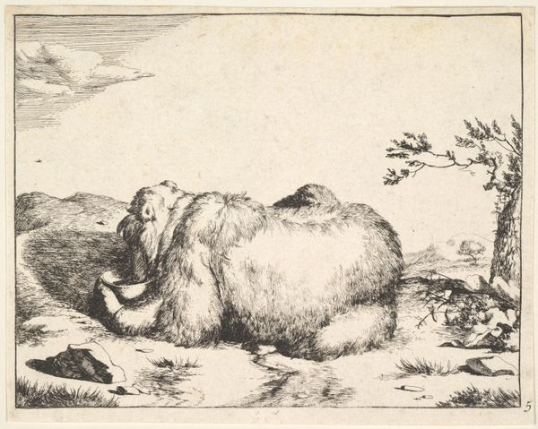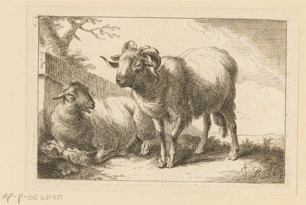 Editor: So, this etching from 1894 by Frans Lebret is titled "Sheep and Two Lambs." It's a very intimate scene; the etching makes it seem fragile and delicate. What stands out to you about this piece? Curator: It's fascinating how Lebret uses the image of sheep, a seemingly simple pastoral subject, to tap into deeper veins of cultural memory. Sheep, across countless cultures, symbolize innocence, sacrifice, and community. Consider the archetype of the Good Shepherd—are these lambs a deliberate invocation of religious themes or a purely secular meditation on nature? Editor: That's interesting, I hadn't thought of that symbolism. So, is the realism then a kind of veil over something deeper? Curator: Precisely! The artist chose a Realism style, to invite us into a space of accessible, everyday experience – however, within that very experience rest powerful, resonant symbols that operate on a subconscious level. The act of etching, too – digging into the plate – mirrors a delving into memory. What emotions does the arrangement of the animals evoke in you? Editor: They seem peaceful, but there's a slight melancholy. The lamb standing alone almost seems vulnerable. Curator: The standing lamb's isolation, set against the close grouping of the others, is quite striking. Could it be about the anxieties of independence, or even a premonition of separation, given the symbolic weight we’ve already discussed? Lebret gives us what seems like an unremarkable scene but encourages us to project emotions. Editor: That's really interesting. I was focused on just the technique and the style, but now I'm seeing so many layers of possible meaning. Curator: Precisely the power of art! Lebret prompts a rich exploration into symbolism, evoking something both intimately personal and culturally eternal. It’s far more than a simple rendering of sheep. Editor: I'll definitely look at Realism differently now. Curator: Excellent. It’s a fine lesson about reading symbols beyond the surface of appearance and acknowledging a longer cultural dialogue, and memory, around it.