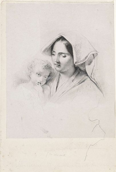 Editor: Here we have Lodewijk Anthony Vintcent's "Vrouw met een kind," made sometime between 1822 and 1842. It's a delicate pencil drawing. The depiction is tender, but the sketch-like quality also feels unfinished. What strikes you about this work? Curator: For me, it's the very *act* of sketching that is most compelling. Vintcent’s quick pencil strokes reveal a process of observation and a certain level of resource. What paper was available? What grade of pencil? This was, in its time, not necessarily 'high art', right? Consider it as part of the broader material culture: the paper, the pencil, the accessibility of art-making materials at that time. How might the cost of these materials shape artistic output? Editor: That’s interesting, I hadn’t thought about it that way. So, you're seeing the material limitations, maybe even democratisation in process? It doesn't feel as posed as some portraits. Curator: Exactly! Its informality leads me to imagine this as maybe a study, almost anthropological. How are different social classes represented, what is their access to artistic documentation? Did this ease or reinforce class differences? I think it questions traditional academic boundaries. This challenges preconceived ideas about value in art-making, wouldn’t you say? Editor: I see your point! So by considering it in terms of materiality and social access, it broadens our understanding. I like that. Curator: Indeed. Viewing this piece through that lens sheds new light on the labour and accessibility involved in art during that period, creating a deeper resonance. Editor: Thanks, that makes me appreciate how it challenges hierarchy within artistic creation and the importance of everyday materials!