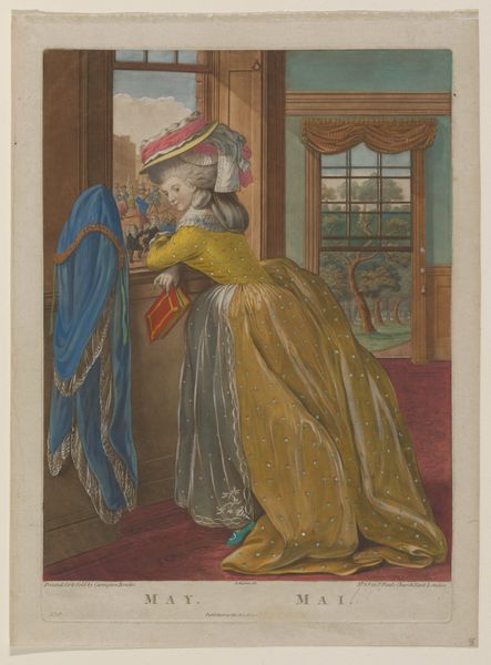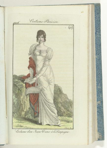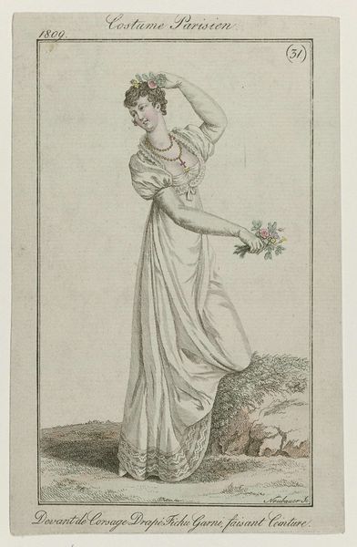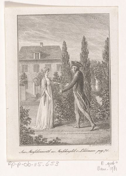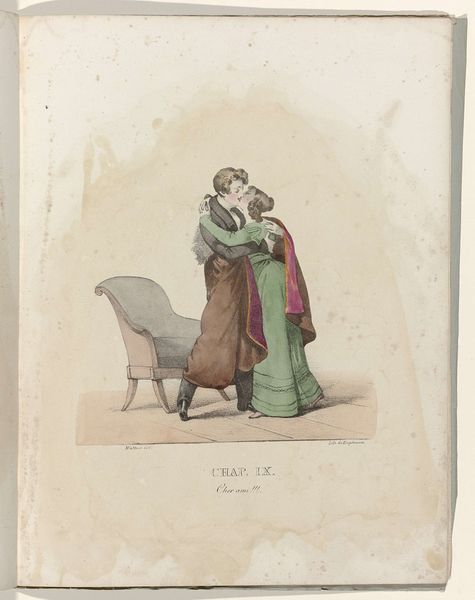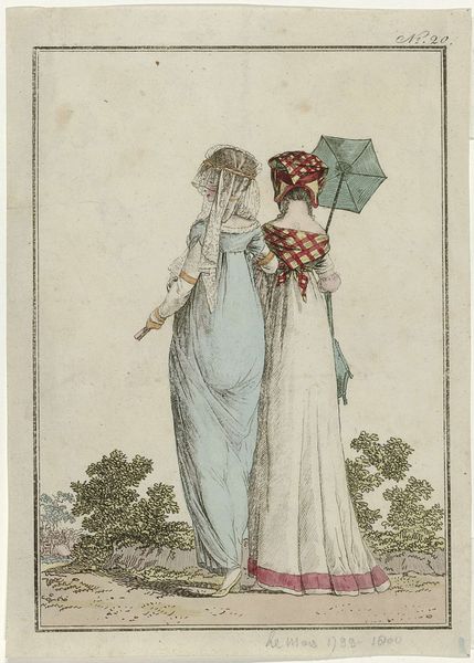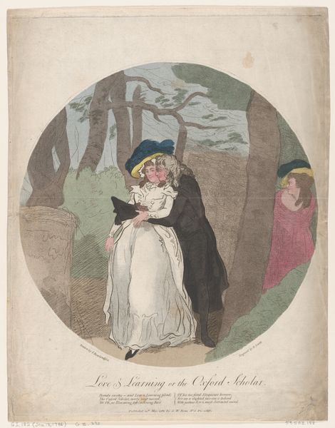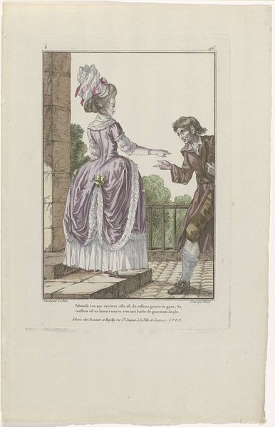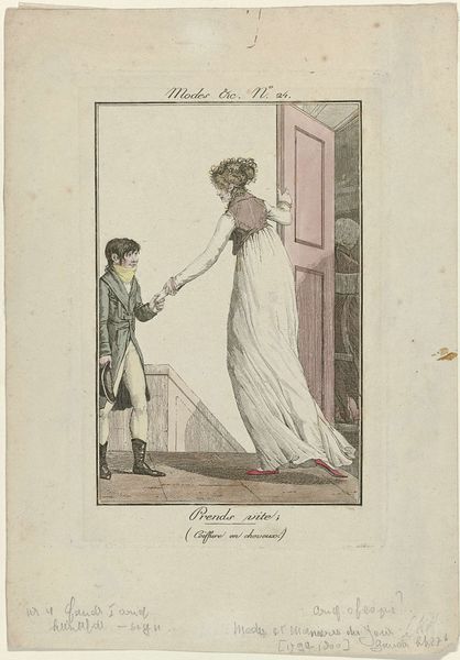 Louis Philibert Debucourt created this hand-colored etching titled "La Phrase changée" around 1799 in France. It presents a snapshot of Parisian fashion and social life during a politically turbulent time. The image creates meaning through its subtle visual cues and cultural references. The woman’s flowing "robe croisée" embodies the neoclassical style, a rejection of the extravagant fashions of the ancien régime. The man, with his more practical attire, seems to be amending a graffitied phrase on the wall, hinting at changing social values, and a shift toward a more egalitarian society after the French Revolution. Is he rewriting love? Is he trying to impress his female companion? The piece reflects the social and political climate of post-revolutionary France, when the old order was dismantled and new ideals were taking shape. Fashion became a means of expressing political allegiance and social identity. Understanding this etching requires a grasp of French history and the role of fashion in expressing social change. By studying sources from the period, we can better interpret Debucourt's commentary on a society in flux.
