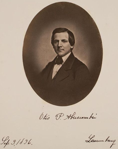 Editor: Here we have a portrait of Seth Miller Murdock by John Adams Whipple. It's a photograph, dating back to the 19th century. What strikes me is the material itself—the sepia tone and the visible texture of the paper. What do you think about how materiality informs our understanding of the piece? Curator: This image is very interesting from the perspective of material production. Consider the labor involved in early photographic processes like daguerreotypes or this possibly albumen print. How does the material and its means of production challenge traditional ideas of art making? Editor: So, it's more than just the image, it's about the context of how it was made? Curator: Exactly. We must consider the social and economic forces that shaped its creation and its value as a commodity. Editor: That really changes my perspective on this piece.