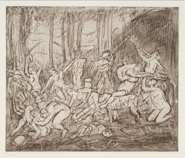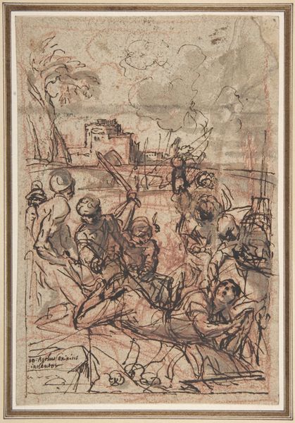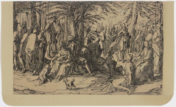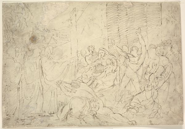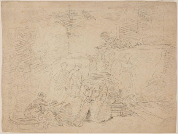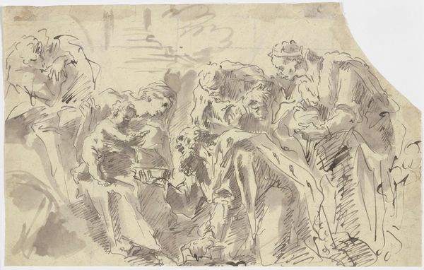 Jean-Baptiste Deshays created this drawing, "A Young Woman Overcome by Love," using brown wash on paper sometime in the 18th century. Wash is made by diluting ink or watercolor with water, and in this drawing, it's applied in loose, flowing strokes. The choice of material is critical. Deshays used it to quickly capture a scene filled with drama. You see the way he layered the wash to create depth and shadow, drawing our eyes to the central figure of the overcome woman. The fluidity of the wash mirrors the tumultuous emotion of the scene. The thinness of the lines suggests the immediacy of the artwork, and how the artist attempted to capture an elusive feeling of the scene. This wasn't about carefully rendering detail, but rather about conveying the raw emotion of the moment. The drawing’s power resides in its ability to capture not just an image, but a feeling. It's a great example of how the choice of materials can amplify the emotional resonance of a work of art, defying any separation between "high art" and the skilled use of humble materials.