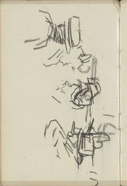 Curator: Here at the Rijksmuseum, we have "Twee ruiters," or "Two Riders," a graphite drawing from George Hendrik Breitner, dating back to around 1884-1886. Editor: Whoa, it's all rough edges and quick takes! Like a scribble of movement, barely there. Curator: Precisely. Breitner was a key figure in Dutch Impressionism, and this piece reflects his interest in capturing fleeting moments of urban life. Think of him wandering around Amsterdam, sketchbook in hand. Editor: It does feel spontaneous. Like a glimpse – blink and you miss it. But something about the lines makes me feel the clip-clop of hooves on cobblestones. You almost feel that rhythm, the weight of the horses, just suggested. It's poetic. Curator: Indeed. Breitner prioritised immediacy. He wanted to reflect the dynamic energy of the city and used his drawings and sketches to develop the larger paintings of his era. In doing so, he documented aspects of city life that were not conventionally featured in art before him. Editor: I see that! There's no varnish, no drama—just reality sketched down quick. You know, the sketch is interesting itself; it gives us access to Breitner's own gaze as an urban wanderer! It humanizes that whole period of time. Curator: Absolutely. This piece offers valuable insight into the artistic process during the rise of modernism, highlighting the shift in artistic values, towards representing modern subject matters. This work allows us to view how social change shaped not only *what* was depicted in art but *how* it was depicted as well. Editor: A scribble speaks volumes! I see those riders – those quick marks come together and that feeling transcends across a hundred years! I'm reminded that art need not be a static representation of something to move the viewer so greatly! Curator: Well put! "Two Riders" captures more than just a scene; it captures a way of seeing and feeling the world. Editor: It's less about perfectly rendered steeds, and more about catching that flicker of movement – that blur, like the city in a rush! And THAT makes it more interesting than many formal renderings of figures on horses.