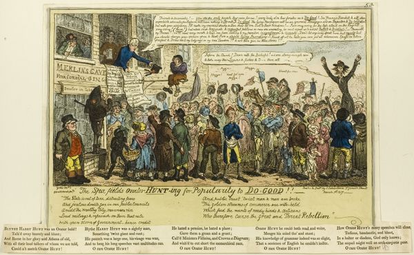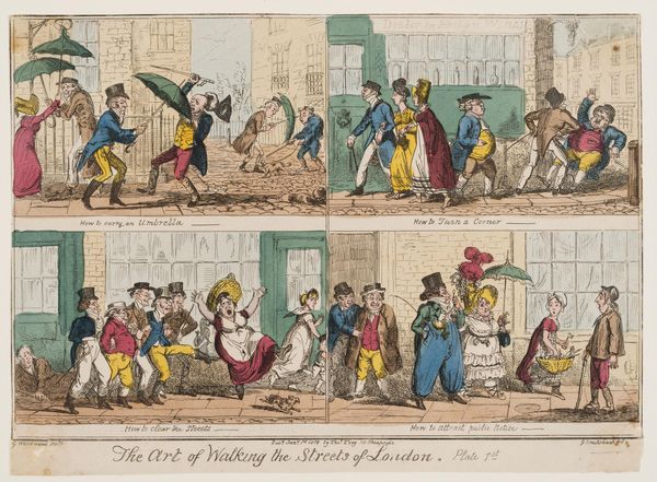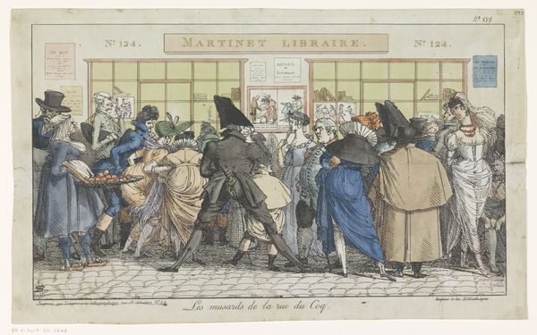 This hand-colored etching attributed to Jean François Bosio shows a crowd gathered outside a bookshop, probably made in France sometime around the turn of the 19th century. The image depicts a Parisian street scene, with a crowd of fashionable people milling about outside "Martinet Libraire," a bookshop. The title, "Les musards de la rue du Coq," translates to "The Loafers of Coq Street," suggesting a commentary on the idle curiosity and social dynamics of the time. The figures, with their exaggerated costumes and poses, conform to a well-established satirical tradition. As historians of art, we can research details about the Parisian book trade. We might also investigate French caricature in the years following the Revolution, as a means of understanding this print in its proper social and institutional context. Understanding the conditions of its production allows us to interpret the political significance of this seemingly simple street scene.