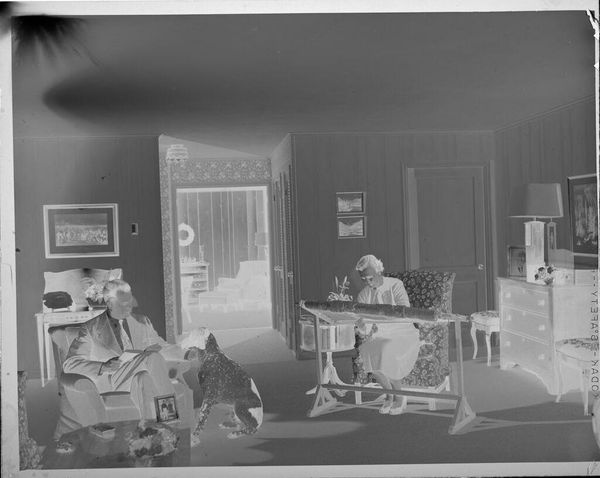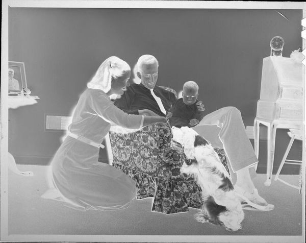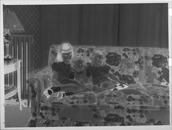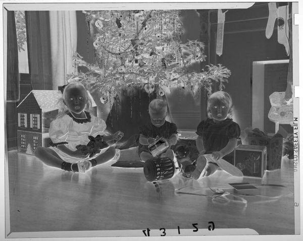 Editor: This photograph by Martin Schweig, titled "Untitled (three children in costumes posed sitting in front of fireplace)," is a fascinating negative image. The children's costumes, especially the striped fabric and the shepherd's crook, are striking. What kind of societal storytelling do you think this work engages in? Curator: It appears to be referencing a Nativity scene, a powerful cultural narrative, often visually consumed, especially around the holidays. The fireplace setting adds a layer of domesticity, perhaps commenting on the commercialization of religious iconography within the home. What do you think about that? Editor: That's a good point, and the lack of artist information makes it harder to place in art history. Curator: Exactly! The image's status as a photographic negative further complicates our understanding of its intent and reception. It disrupts the traditional heroic narrative and prompts a dialogue about the politics of representation. Editor: I see it differently now. Thanks for your insight! Curator: My pleasure! These kinds of images certainly offer a rich lens for historical interpretation.