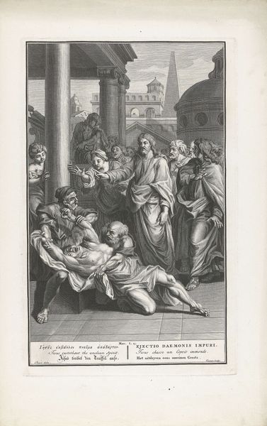 Editor: This is “Zecharja wordt gestenigd,” or “The Stoning of Zechariah,” an engraving made in 1582 by Johann Sadeler I, currently held at the Rijksmuseum. It depicts, rather vividly I must say, the biblical stoning of Zechariah. It’s incredibly detailed, but also kind of… chaotic? What catches your eye most in this work? Curator: Oh, absolutely chaotic, in the best possible way! I find myself drawn to the architecture. It's a fascinating blend of Roman grandeur with a touch of something… almost dreamlike. The figures seem almost incidental to the meticulously rendered columns and arches. Does that resonate with you at all? Editor: I can see that, yeah. The architecture almost dwarfs the figures. It's like the stage is more important than the play. Curator: Precisely! And it's the Mannerist style that allows for this wonderful… disquiet. Look how everyone's muscles are so exaggerated, their poses so dramatically contorted. It’s theatrical, isn't it? It makes me think about how stories are told, and who’s doing the telling. In this case, the viewer becomes both spectator and maybe a little bit complicit, no? Editor: Definitely. I can feel the tension, like I’m right there witnessing it. Curator: Exactly! The engraving allows you to peer through the shadows into this strange world. Almost as though it were a window through time. Editor: I hadn’t thought of it that way before. It's a bit unnerving but completely engrossing. I came in thinking just about the story, the stoning itself. But you’ve made me see it as so much more! Curator: It’s just the magic of the engraving technique. And with all the layers of complexity it can convey. It has the ability to draw the viewer in like few other mediums can!