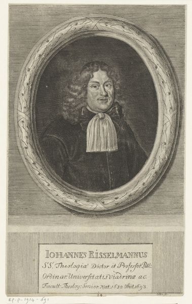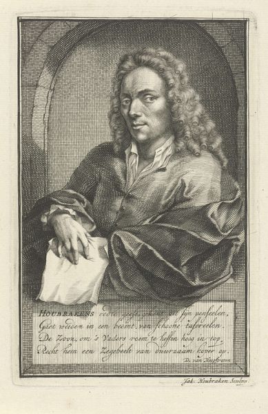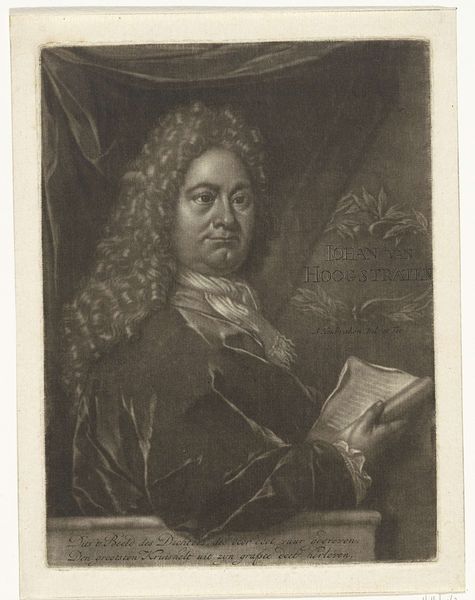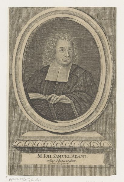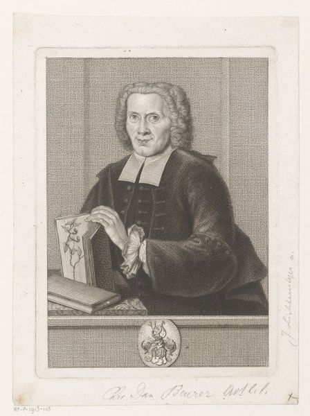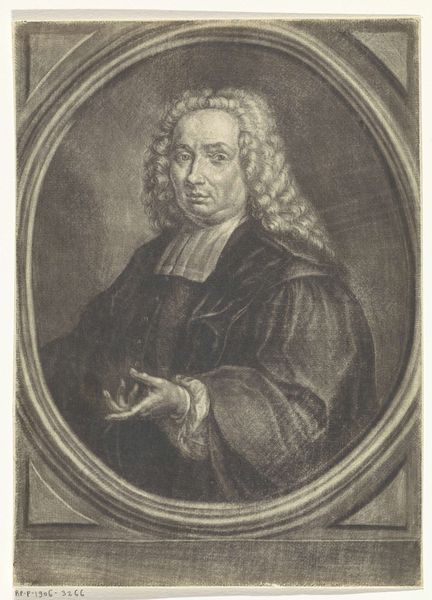Curator: Here we have Hendrik Pothoven’s "Portret van Friedrich Adolph Lampe," completed around 1748. It's a study in charcoal, pen and paper, and holds a certain…gravity. Editor: Gravity is right! The whole piece has a sepia tone. Our subject looms, his eyes direct, hand raised in what feels like a very considered gesture. There’s a touch of stage presence to him. Curator: The Baroque style really lends itself to that drama. Lampe was a prominent theologian, and Pothoven seems to have captured that sense of authority. The frame around him acts almost like a proscenium, presenting him to us. That gesture, a professor's pointer. It adds another layer. He appears poised, thoughtful, about to lecture, right? Editor: Yes, he definitely embodies a figure of intellectual authority. It’s interesting how the shadows are deployed too—obscuring some areas and highlighting his face and hand. Light and shadow carry weight. It creates a specific emotional feel. Curator: Precisely! The chiaroscuro is deliberate. Consider the gaze as a tool. What is our memory response, what does this portrait make us think about? Editor: He embodies an era of thinking, now faded into a dream. His wig seems like something from a lost dream now, and it makes me ask myself... In what dream does his truth and learning still make sense? Or is it possible at all? Curator: It all comes down to the weight of the signifiers, right? Wigs, robes, gestures all carry embedded context to give this portrait strength. It almost feels theatrical now. But I think the work endures, even without knowing Lampe's specific theological contributions. Pothoven captured an archetypal presence. Editor: An era perfectly distilled in shades of grey... it makes you wonder what the 21st-century version would be, right? Curator: I do hope our version involves charcoal! Thanks for considering this with me.