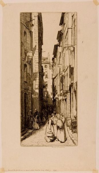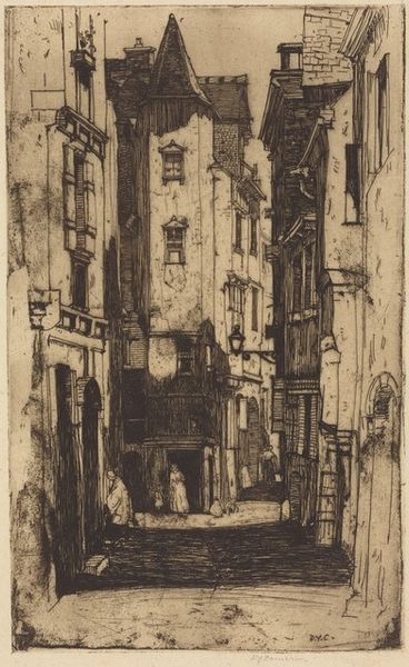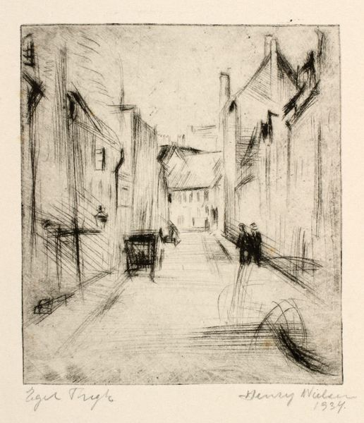 John W. Winkler made this print, 'Dark Alley,' using etching, a process of mark-making that really leans into accidents and chance. I love how the lines here feel both precise and totally off-the-cuff. Look at the way he renders depth – those long, almost scribbled lines that suggest the receding space of the alley. It’s like he’s wrestling with perspective, not quite nailing it, but somehow, that's what makes it so interesting. The roughness of the etching emphasizes the gritty feel of the alleyway. It's not a pretty picture, but it's real. There's a bucket right at the bottom of the image, rendered with just a few quick lines. It’s so simple, but it grounds the whole scene, like a little anchor in all that shifting space. It reminds me of some of James Ensor's prints, where everyday objects take on a strange, symbolic weight. Ultimately, this piece celebrates process over product, inviting us to find beauty in the imperfect and the unresolved.