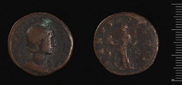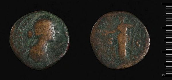 Editor: We're looking at an "As" of Faustina II. It's a small, metallic coin, and it feels so ancient, so tactile! What do you notice about its composition? Curator: The coin presents a compelling study in relief. Note how the effigy of Faustina is rendered in high relief on the obverse, contrasting with the lower relief of the figure on the reverse. Consider the interplay of light and shadow this creates, enhancing the dimensionality. Editor: So, the depth creates interest. Is there a tension between the two sides? Curator: Precisely. The patinated surface, while obscuring fine detail, contributes to an overall aesthetic of age and historical weight. Observe also the coin's circular form, a self-contained universe of imperial representation, fragmented in its preservation. How does its materiality affect your experience? Editor: It is like holding a tiny piece of history. It all comes down to how the artist uses those simple elements to convey a sense of power and history. Curator: Indeed. The formal elements speak volumes about the values and aesthetics of its time.