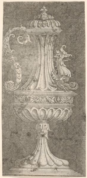 Albrecht Altdorfer created this print, "Ewer with a Siren," using the intaglio process of etching. The image is brought to life through the delicate dance of acid biting into a metal plate, capturing the intricate details of the ewer's form. Altdorfer’s skill is evident in the way he articulates the vessel's ornamentation, from the sinuous handle ending in a dragon's head, to the acanthus leaves encircling its base, and the grotesque siren figures flanking each side. Note the methodical labor evident in the cross-hatching, which creates the tonal gradations and the illusion of three-dimensionality. The ewer's form seems almost like a fantastic architectural model, indicative of the period's fascination with idealized forms. The emphasis on decorative prowess and the ability to master the printing process would have positioned Altdorfer within a network of skilled artisans, aligning him with the values of craft production as much as with those of fine art. This image of luxury, produced through skilled labor, blurs the boundaries between the functional and the fantastical.
