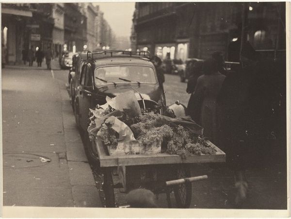 Curator: Let's turn our attention to "Street Vendor, Paris," a photograph captured by Robert Frank in 1951. Editor: A city dreamscape steeped in melancholic stillness. There’s a certain loneliness emanating from that lone figure beside the cart. Curator: Indeed. Frank’s compositions frequently capture moments of urban isolation and quiet observation. Here, note how the harshness of the street lighting interacts with the vendor's posture. It emphasizes the bleak atmosphere. Editor: She's enveloped by shadows, a puff of cigarette smoke her only company. It’s romantic, yet tinged with a certain grit—Paris, stripped of its glamour, seen from the periphery. I feel as if I could reach out and smell the wet pavement. Curator: That's precisely Frank's intent, to offer a less-than-idealized portrayal of the city and its inhabitants. Consider how the cart laden with her goods, a vital aspect of her existence, seems almost like an extension of herself. It is heavily symbolic in its own way. Editor: It is also her burden, her constant companion in this concrete jungle. A reminder of the cycle, a poignant vignette of daily toil set against the backdrop of Parisian chic. It invites the gaze, but keeps the subject safely at arm’s length, leaving space for reflection on life. Curator: Ultimately, what this image offers is the possibility to see the ordinary and everyday anew. Through the contrasting light and shade, we observe the geometry of her urban condition. Editor: It whispers tales of persistence, of earning a living amid beauty. In other words, this unassuming street vendor becomes a lens through which we understand humanity and the spirit of a city. It stays with you, this frame.
