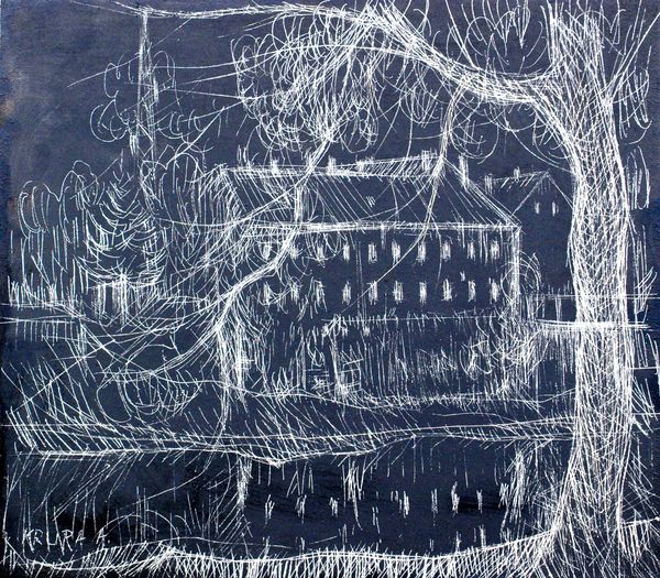 Curator: Gerd Winner's "Window" presents an immediate textural density, doesn't it? A visual field teeming with marks. Editor: Yes, I'm struck by how it evokes a sense of confinement, of looking out from behind a dark, almost oppressive barrier. Curator: Note the chromatic scale; Winner masterfully uses the blues to create depth through tonal differentiation. The repeated grid acts as the picture's formal structure. Editor: That grid reminds me of prison bars, or perhaps the psychological barriers we build ourselves. The window, a promise of seeing, is obscured. Curator: Perhaps, but the image's strength lies in how its formal elements engage. The use of space and the application of ink are what really hold our attention. Editor: Still, I can't shake the feeling of melancholic isolation it inspires, a universal yearning to escape. Curator: A fascinating interplay, indeed, between form and perceived symbolism. Editor: Precisely. A work that continues to reveal itself.
