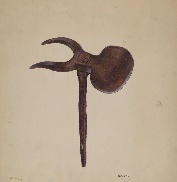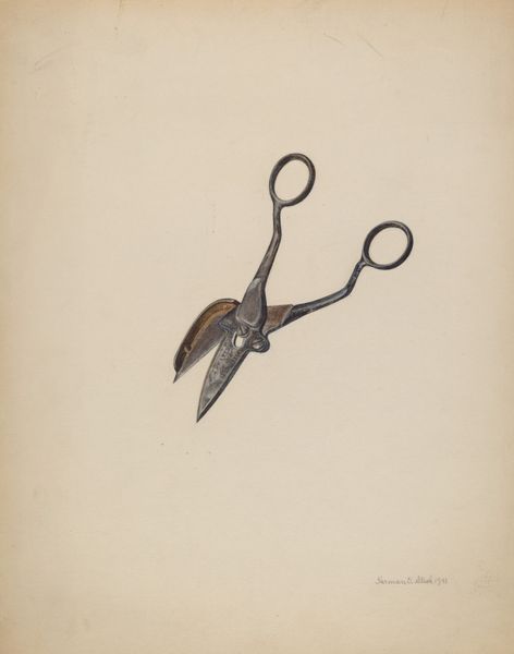Curator: Fritz Boehmer, around 1939, created this mixed-media drawing titled “Latch.” It presents a somewhat abstracted, close-up view of precisely that – a latch. What strikes you first about the piece? Editor: Its curious simplicity, paradoxically. The latch fills the frame, asserting its form with clean lines and quiet dignity. But it also possesses a melancholy stillness—an almost unsettling silence. Curator: A silence embedded in a commonplace object. We interact with latches daily, hardly registering their presence. Boehmer asks us to reconsider the symbolic weight of a functional object that governs entry and exit. What is held inside? What is kept out? These are very charged ideas at the close of the 1930s. Editor: True. The medium itself seems significant; the subtle gradations achieved with pencil and watercolour lend the metallic object an almost ethereal quality. The rendering isn't photographic, though. The stark simplicity is deliberate. Curator: Look at the gentle curves offset by the rigid angles. There’s a psychological tension—the domestic, yet fortified. During this period, physical security was often compromised, leading to emotional insecurity, so an item that secures the domestic space is important, even archetypal. Editor: I'm intrigued by the lack of context, though. It isolates the latch from any specific door or gate. The latch exists purely as an object of scrutiny, allowing for a deeper contemplation of form. Do you agree it serves almost as an abstract meditation? Curator: Certainly. By divesting the latch of its immediate purpose, Boehmer allows it to become a vessel, carrying concerns about security, safety, and the longing for stability, as its cultural function becomes more profound and complex. Editor: So it transforms from mere functional hardware to a signifier pregnant with meanings of shelter and denial, freedom and imprisonment, even longing and nostalgia, I think. That's quite profound. Curator: And it’s beautifully rendered. Thinking about this latch as more than just a latch deepens the aesthetic appreciation, wouldn't you agree? Editor: Yes, viewing it formally and symbolically adds complexity. Thank you for showing me such interesting work today.