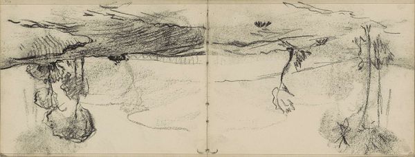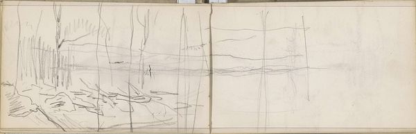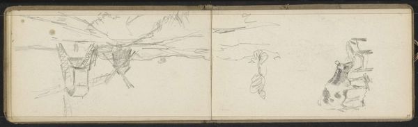 George Hendrik Breitner created this sketch, "Figuur, mogelijk bij een schip," using graphite on paper. The composition is divided into two distinct zones, each offering a different visual experience. The left side is an open, airy space with faint lines that suggest a sense of distance and atmosphere. On the right, we see a dense network of lines forming a figure, possibly near a ship, with a figure standing on deck. The sketch displays a contrast between open space and concentrated form. The lines feel exploratory, almost like a mental mapping of space and form. Breitner seems less interested in precise representation and more in capturing the essence of a fleeting moment. The visual tension between the defined and undefined invites us to contemplate the act of seeing and the subjectivity inherent in perception. This work serves as a reminder that art is not about mirroring reality but engaging with its underlying structures.