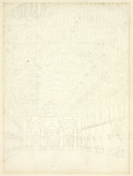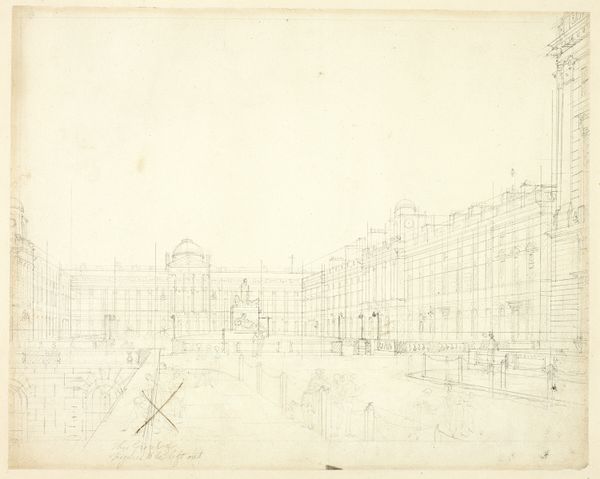 Curator: This is a preparatory sketch by Augustus Charles Pugin, titled "Study for Billingsgate Market, from Microcosm of London," created around 1808. The Art Institute of Chicago holds it. The artwork uses graphite and etching on paper to render the detailed urban scene. Editor: It’s a whisper of a city, isn't it? So faint, like a memory almost lost. I feel the market, even though the lines are so delicate. Curator: Pugin made this drawing as preliminary study for a print in "Microcosm of London," a visual project intending to capture the city’s architectural landmarks and quotidian public life. This shows his working process—laying out composition and architectural details. Editor: You know, it’s amazing how much information is conveyed with so little. The artist is essentially constructing this bustling marketplace with mere hints— suggesting energy and atmosphere with just a few carefully placed lines. You can almost hear the fishmongers. Curator: Yes, the printmaking techniques are very intentional, etching and graphite provide details of the architecture. The architecture in contrast with the people indicates social hierarchy and structure, where one cannot live without the other. The study and final etching are artifacts of the period that also reflect larger issues of urbanization, commerce, and labor practices that historians can study further. Editor: It's interesting you mention hierarchy, I see a sense of…communal chaos. These little lines all squished together in the foreground forming this, well, democratic mob! And beyond, that serious facade looking down on it all. I guess Pugin is playing with tension—restraint versus frenzy? Curator: Exactly! And remember, the "Microcosm" project itself was driven by an intention: to define London through its buildings and people as a symbol of British progress and civilization, where Billingsgate serves as one crucial scene. Editor: So, in essence, a sales pitch, framed in line and shadow. Despite being just a study it feels so vibrant and lived-in— more compelling than any perfectly finished piece, to me at least. Curator: I agree. This study allows us to see the layers, both literal and figurative, of how urban life was perceived and represented in visual culture at the beginning of the 19th century. Editor: It certainly does give one pause. Curator: And provides great insight to London’s bustling economy in the early 1800s.