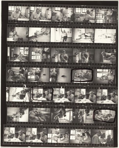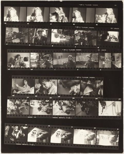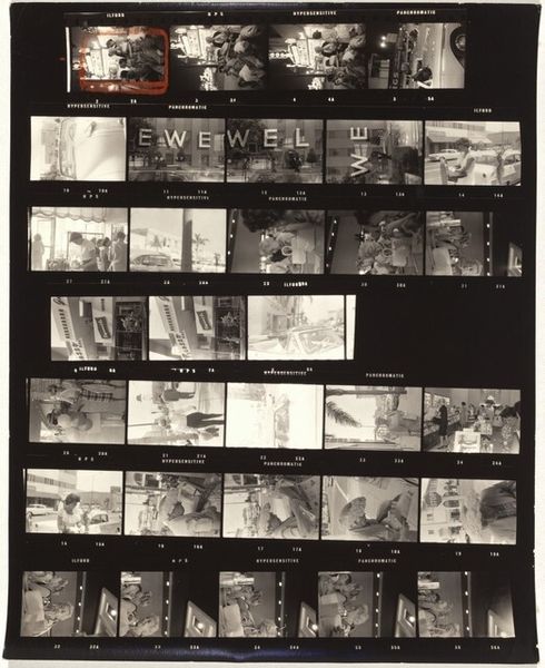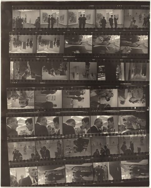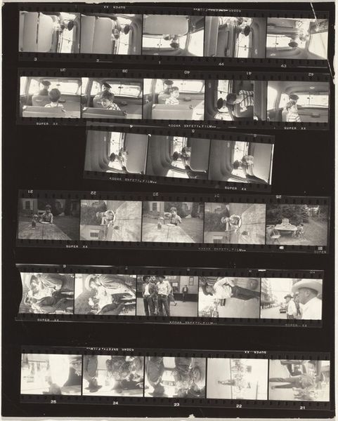Curator: Here we have Robert Frank's "Guggenheim 520—Metro-Goldwyn-Mayer studio, Universal City, California," taken in 1956, a gelatin-silver print offering a behind-the-scenes glimpse of Hollywood. Editor: The visual rhythm of the frame itself is striking. All of the frames and shots juxtaposed really creates this anxious atmosphere, right? You see a rigid corporate studio executive working diligently but then some shots that capture the bare landscapes where they film Westerns, creating a disconnect. Curator: It certainly points to that tension. I notice how the recurrent image of the framed picture within some of the filmstrip's individual frames emphasizes the layers of representation involved in creating images. We’re seeing images within images, pointing to ideas about perception, about constructed realities, and about our consumption of stories. Editor: That's perceptive. Formally, I’m drawn to the play of light and shadow, and the high contrast creates a strong sense of depth, dividing and segmenting a surface-level gloss. It’s really that repetition, not of form so much but of mise-en-scène, that strikes me—desks, props, all symbols of this manufactured dream-space. Curator: Absolutely. It’s as though Frank is dismantling the image-making machine by showing us the repetitive actions, the sets, the man working dutifully and creating images. It invites contemplation on the meaning and cultural impact of filmmaking itself and suggests how myth and reality are always bound up together. The executive, working in that very stark, bright studio…there is an emptiness there. It feels so unnatural to observe. Editor: The work is visually compelling and intellectually stimulating, right? Frank invites us to consider the framework behind the silver screen, creating almost like a negative film reel, in an ironic twist. Curator: I think that's right. A powerful and unsettling comment on American culture. Editor: Yes, Frank’s sharp composition leaves me wondering how the Hollywood myths we all absorb really structure our thoughts and desires, ultimately.