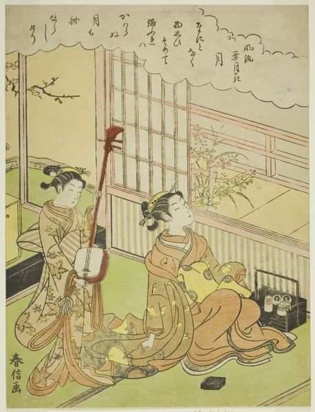 Chōbunsai Eishi created this woodblock print, "Wakana, Part 1" as part of "A Fashionable Parody of the Tale of Genji" series during a time when Japanese society was highly stratified. Eishi, son of a samurai, turned away from his inherited status to pursue art. Here, he reimagines a classic tale through the lens of contemporary fashion and societal norms. The print presents an opportunity to think about gender roles. The women are adorned in elaborate garments and hairstyles, markers of status and beauty. Yet, they are also confined to certain spaces, like the interior garden depicted here. The male figure, likely representing Genji, holds a symbolic object, perhaps a peach, indicative of his position of power. The work operates as both a reflection and a gentle critique of the social expectations placed upon individuals based on their gender and class within the Edo period.