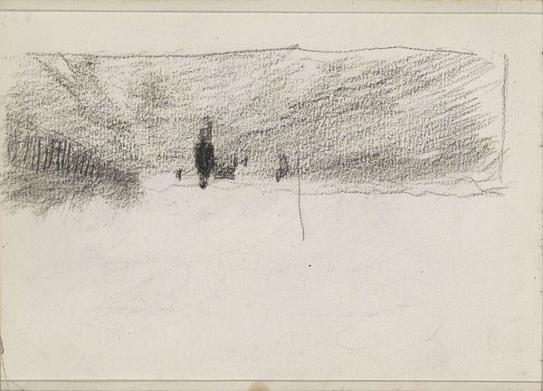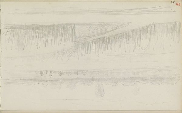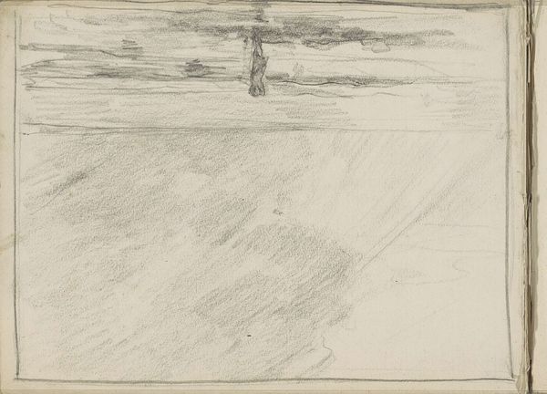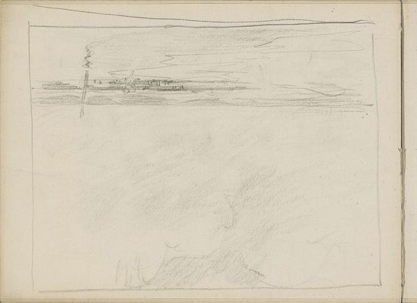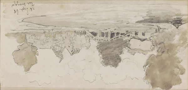 Editor: This pencil and watercolor drawing, "Gezicht op een landtong met figuren in en bij het water," by Monogrammist DS, is from sometime between 1850 and 1950. The first thing that strikes me is how rudimentary it looks, almost unfinished. What do you see in this piece, beyond the apparent landscape? Curator: I see the labor, or perhaps the lack of it. It's not just the unfinished appearance, but the accessibility of the materials: paper, pencil, perhaps a quickly mixed watercolor wash. The artist isn’t investing in high-end supplies or a laborious, time-consuming technique. This speaks to a certain social context, wouldn't you agree? Was this for personal study or for sale? Who would the intended audience have been? Editor: I hadn't considered that the simplicity could be so telling! Perhaps it reflects a burgeoning middle class with a taste for art but without the budget or desire for elaborate works. Maybe the quick sketch enabled accessibility through the material production? Curator: Exactly! And think about the 'landscape' genre itself. Landscapes are easily commodifiable—a snapshot of the owned, consumed, or to-be-consumed land. Inexpensive materials lower the barriers to creating these "snapshots". Who would own this view in this era? What purpose could this sketch fulfill as a stand-in? What labor goes unacknowledged? Editor: So, beyond just being a pretty picture, it's intertwined with economic and social factors impacting artistic production and consumption... I never would have thought of that just looking at it. Curator: It’s all interconnected. Considering the materials and means of production illuminates the whole social landscape, doesn’t it? The image and our ability to assess it. Editor: Absolutely. Looking at art through that lens, seeing the socio-economic dimensions of materials and production, is very illuminating. Thanks!