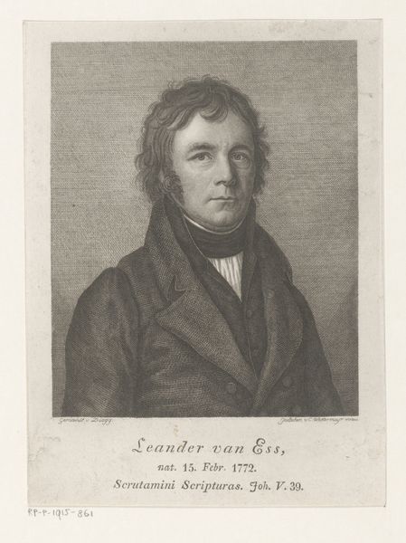 Curator: Editor: So, here we have a portrait of Leander van Ess, sometime between 1803 and 1841, engraved by Martin Esslinger. It feels rather…stiff. Almost severe, wouldn’t you say? What jumps out at you when you look at it? Curator: Ah, yes, “stiff” captures a certain stoicism quite perfectly. He seems a man out of time, doesn't he? I’m struck by the sheer discipline of the engraving itself. Notice the dense network of fine lines. It’s almost…scientific, wouldn’t you agree? You could say he’s wearing his intellect like armor. Tell me, do you sense any vulnerability beneath that stern gaze? Editor: I see what you mean about the detail – the engraver's precision definitely lends it an almost clinical air. I hadn't really considered whether his expression might mask some sort of…inner turmoil. Perhaps a slight weariness in his eyes? Do you think that reading of emotion into this portrait is justified, or is that simply wishful thinking on my part? Curator: “Wishful thinking” can often be insightful seeing that as a lens through which we meet the world. Maybe the better question is what that expression evokes for you. Doesn’t this portrait reveal something interesting, beyond what we read from books and what we're being taught by art? Editor: You're right; it made me realize that even seemingly straightforward portraits can have layers of hidden emotions waiting to be uncovered, if only we look closely enough. Curator: Precisely. Perhaps all we really see is our own reflections cast onto art.