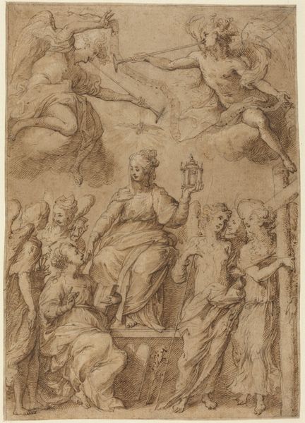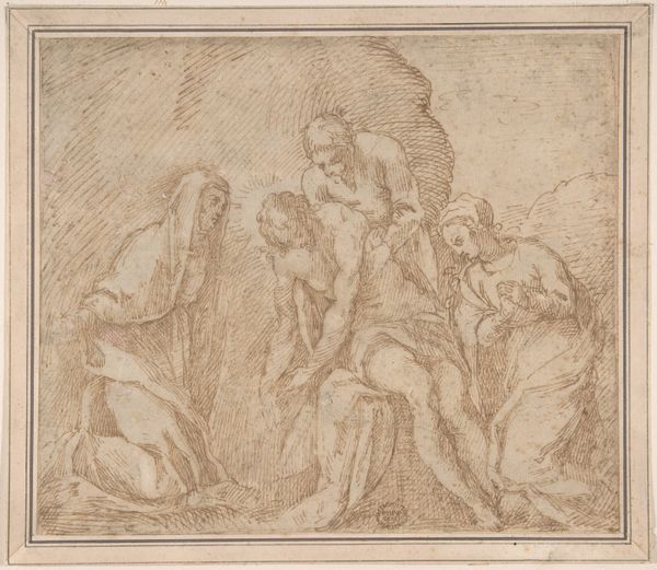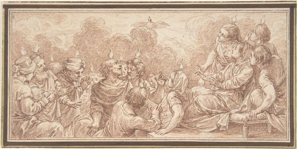 Editor: This is Ercole Graziani the Younger's "Adoration of the Magi," created sometime between 1688 and 1765. It's a drawing, with visible use of pencil and charcoal. There's a gentle, almost dreamlike quality to the piece. I wonder, what visual traditions or symbols are at play here? Curator: The scene is indeed a rich tapestry of symbolic and visual echoes. The Adoration itself, of course, carries immense cultural weight: the three Magi represent different continents and ages, united in acknowledging the Christ Child. Do you notice anything peculiar about how the artist renders their gifts? Editor: I see that one Magus carries a covered bowl. I thought the gifts were frankincense, gold, and myrrh. Curator: Precisely. The obscured nature of the gift intrigues me. Perhaps it invites contemplation of hidden meanings or the mystery of faith itself. Then observe the light emanating from above—not just a natural light source, but a beacon suggesting divine presence. Does the classical architecture provide another layer? Editor: It does; the column seems almost like a ruin, a past order yielding to something new. How might that reading shift if we considered the context of the Italian Renaissance? Curator: The Renaissance looked back to classical antiquity for inspiration, yet this scene filters those classical forms through a distinctly Baroque lens. The drama, the dynamism of the figures, it all heightens the emotional impact, doesn't it? But what continuous cultural memories of divinity did the artwork draw upon and add to? Editor: That's a fascinating question – how the image both borrows from and shapes our understanding of this event. Curator: Exactly. This drawing, therefore, is more than just a depiction; it’s an evolving symbol resonating through time, continuously renewing its meaning with each viewing.
