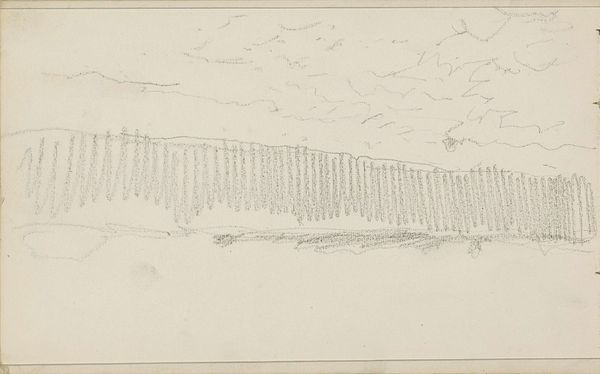 Editor: This is "Figures in a Meadow Bordered by a Ditch" by Jozef Israëls, likely created between 1834 and 1911. It's a pencil drawing on paper, currently at the Rijksmuseum. The sketchiness gives it a very ephemeral, fleeting quality. What do you see in this piece? Curator: For me, this sketch is compelling precisely because it showcases the artist's process. We're given a glimpse into the labor of landscape representation. The quick pencil strokes aren't about perfectly rendering a scene; they're about understanding and recording Israëls’ impression. Consider the availability and affordability of paper and pencils at that time - who had access, and what did it mean to depict such a common scene? Editor: That’s interesting. I hadn’t considered the material conditions. So, the value isn't just in the finished artwork, but also in the tools and act of creation itself? Curator: Exactly. Think about the labor involved in producing those pencils, the access to materials needed for the paper. And also consider who gets to depict these scenes, how this process intersects with social class, land ownership, and power structures. Were the 'figures' in the fields also creating art or otherwise enjoying the use of artist’s materials? Editor: That reframes the sketch entirely! I was focused on the 'Impressionism' tag, but this reading highlights the means through which this impression was even possible. How do you think this work challenged or reinforced existing art boundaries, considering this lens? Curator: By focusing on the "everyday" landscape using inexpensive, mass-produced tools like pencils and paper, Israëls blurred the lines between "high art" meant for the elite and the kind of accessible mark-making that anyone could attempt. The question becomes less about artistic genius and more about access, labor, and the materiality of representation. Editor: This has completely shifted my perspective! Now I see it as more than just a quick sketch; it's a record of material possibilities and a quiet question about who has the tools to represent the world around them. Curator: Precisely. And that, in itself, offers a potent reading.