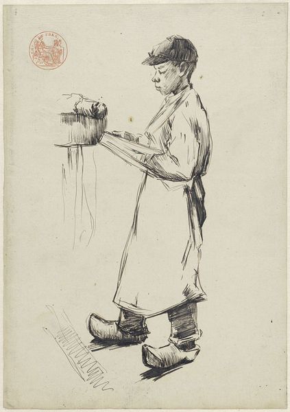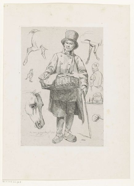 Editor: Carl Bloch’s 1882 etching, “The Grocer at his Counter,” has a certain austere quality. The detail in his face is incredible for a print! What do you see in this piece from a formal perspective? Curator: The interplay of light and shadow, achieved through the intricate network of etched lines, constructs both form and texture with remarkable precision. Note how the varying densities of these lines articulate the grocer's furrowed brow and the subtle gradations on his apron. Editor: Yes, and there’s a definite contrast in textures. His face and hands are heavily detailed but the background almost disappears! Curator: Precisely. The artist manipulates visual information strategically, prioritizing texture and the formal relationships between line, tone, and shape within the composition. Consider the deliberate arrangement of the still life elements: bowls of indistinct edibles are horizontally composed and counterbalanced by the vertical orientation of the grocer. Editor: So, the composition isn’t accidental? It's carefully designed with visual balance in mind. Curator: Indeed. Notice also how the composition employs tonal contrasts. It enhances depth and establishes visual hierarchies. The manipulation of these elements underscores a clear artistic intent and transforms the mundane subject into a sophisticated arrangement. Editor: This has totally reshaped my perception. I had missed all these subtle artistic decisions focusing purely on the representational element. Curator: Observing the form refines the perception, doesn't it? Every element contributes meaningfully. Editor: Definitely. I now appreciate how technique itself generates layers of content and aesthetic quality in a work like this!