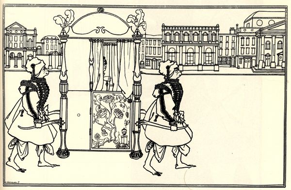 Editor: This is Ivan Bilibin’s 1909 ink and paper illustration for the tale “Wooden Prince” by Alexander Roslavlev. There’s such a captivating use of detail, with distinct stylization that gives the illustration a real sense of otherworldly folk art. What do you see in this piece, in terms of the symbols? Curator: Notice how Bilibin weaves together imagery of the puppet theater with motifs drawn from old Russian folk tales. What does the central figure of the ‘Wooden Prince’ evoke for you? Think of Pinocchio, perhaps. Editor: Right, a sense of artifice. He appears frozen, separate. Curator: And consider the significance of the goat. In many cultures, the goat is a symbol of abundance, but also of trickery and the irrational. Does its presence shift your understanding of the illustration's narrative? Is it blessing or critique? Editor: I see your point. Its bleating visage undermines any straightforward celebratory reading. Curator: Bilibin cleverly layers multiple visual languages. We have the visual echoes of medieval manuscript illumination mixed with sharper, Art Nouveau lines. Do these create tension or harmony for you? Editor: A bit of both. The linear detail suggests control, yet the combined symbols hint at chaos bubbling beneath. Curator: Precisely! What appears charming on the surface has darker undercurrents. He is definitely using cultural memory and giving it a spin. Editor: That tension between order and implied chaos makes this far more engaging. I'll look for Bilibin's work now that I understand this layering. Curator: Me too; it's always great when artworks present so much cultural context to think about.