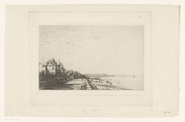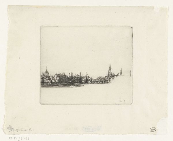 Curator: I am immediately struck by the overall mood – a sort of fragile stillness hanging in the air. Editor: We’re looking at Charles Meryon’s etching from 1860, "Passerelle du Pont-au-Change, après l'incendie de 1621." He made it after a drawing by Della Bella. You sense that fragility acutely in the architecture. The titular footbridge is just so… precarious. Curator: Precarious but functional, I imagine, patched together in response to the destruction. There’s a certain improvisational, almost slapdash quality to it that I find intriguing. You can practically smell the charred timbers. Editor: Exactly. I want to point out that this work isn’t a straightforward depiction of the event itself but a layered engagement. Meryon meticulously recreates Bella’s drawing, filtering it through his own 19th-century lens. Think about the labor involved here. Meryon is mediating another artist's representation of a disaster centuries prior. Curator: So you’re suggesting it’s not merely about documenting history, but about the layers of representation, of human responses to catastrophe as it’s remembered and recreated? There’s something about the detail in the boats on the water, the way the light hits… I keep thinking of how materials tell us about trade and how bridges are all about that, connecting economies but also always being so very vulnerable. Editor: The print itself acts like the footbridge in the picture - temporary. Meryon is always looking to the past to describe the current, and what might become the future, given time and perhaps tragedy. It is thought-provoking. Curator: It is. You've given me something to think about. Editor: Likewise. Meryon often does that.