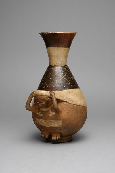 This strap-handled jar, in the form of a feline-serpent, was crafted by the Moche people. The vessel presents a complex configuration of forms and lines. Note the way the artist has integrated a feline head and a serpent's body into a functional jar. The handle and spout add verticality, contrasting with the vessel’s overall rounded form. The diagonal painted patterns break up the surface, creating a dynamic visual rhythm. The composition destabilizes our expectations of natural forms by merging animal features into an inanimate object. It invites us to consider the symbolic potential of hybrid creatures, which could represent transformation or duality. Consider also how the interplay between the jar’s utilitarian function and its elaborate decorative form complicates simple categorization, merging art and life. The jar is not just an aesthetic object but a cultural artifact loaded with symbolic meaning.
