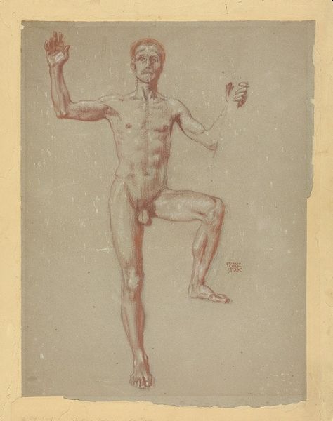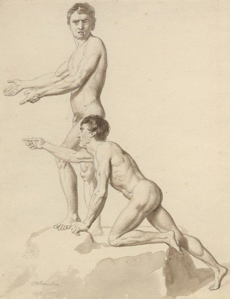 Josephus Augustus Knip made this drawing titled 'Two Male Nude Studies' with pencil. The light gray hues and the absence of a distinct background puts the focus squarely on the male bodies, set against the stark white paper. The artist’s use of line is delicate, capturing the contours of the figures and emphasizing the play of light and shadow on their forms. Knip presents the male form with an attention to classical ideals, yet the relaxed, informal poses suggest a departure from rigid academic traditions. One figure is seated and contemplative, while the other stands with an outstretched arm, creating a dynamic contrast. The use of shading and cross-hatching gives volume to their muscles, hinting at the influence of anatomical studies prevalent during this time. The drawing encapsulates a moment of transition, where classical forms intersect with a burgeoning interest in naturalism. The composition invites us to consider how Knip navigates the boundaries between tradition and modernity, exploring new ways of representing the human form within established conventions.