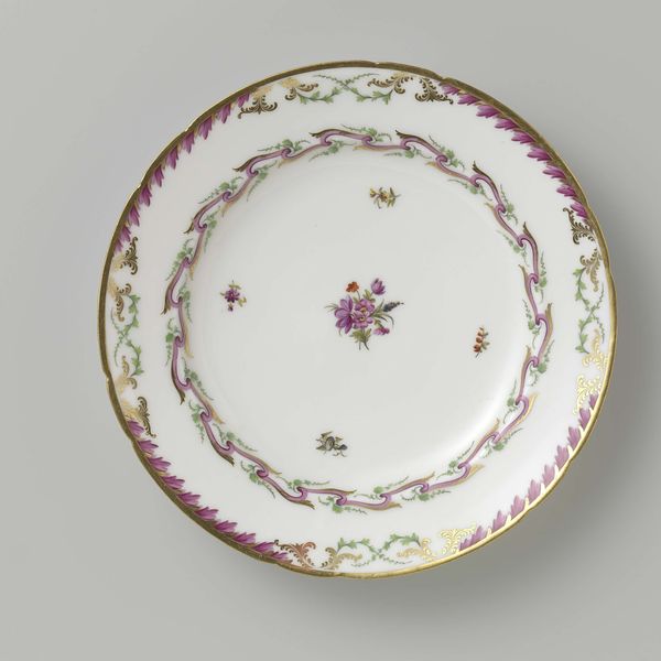 Curator: Here we have a “Tureen and Stand” produced around 1764 to 1768 by the Weesper porseleinfabriek. It’s a beautiful example of Dutch porcelain. Editor: It’s quite delicate. The floral decoration gives it an air of restrained elegance. It feels like it belongs at a very formal tea party. Curator: Absolutely. The floral motifs are intriguing, aren’t they? In this era, floral symbolism was incredibly rich. The choice of flowers, their arrangement, would all contribute to the overall meaning. Editor: So, not just decoration, but language? What do you think, in that cultural language, the purple roses, with their rather subdued shades, are communicating here? Curator: Historically, purple roses suggest enchantment and could hint at an idealized sense of beauty or perhaps even mourning or apology. Think about who might have commissioned or owned this piece and the social conventions they operated within. Consumption like this served a real communicative and competitive purpose within society at the time. Editor: I agree it’s far from arbitrary. It's interesting how porcelain became this material of almost… enforced gentility? Delicate forms and even more delicate surfaces demanded an equal level of restraint in its handling and viewing, creating a material hierarchy as much as an aesthetic one. The rising middle class were becoming more active participants in material culture, weren't they? Curator: Indeed, there’s an aspiration evident here. Owning such a piece signalled more than wealth; it spoke to a commitment to a certain lifestyle. I mean, think about the technical skill, the labour involved. Someone would’ve been trained over a long time in the production of ceramics like this. Editor: Yes, when you really begin to imagine the layers of process, from extraction of the raw materials to final product and ownership. You also start to consider the access that somebody had to partake in what we understand as leisure and aesthetic pursuits at the time. Curator: Precisely. Hopefully listeners will take this information, apply their own critical frameworks, and generate new theories of the function of craft! Editor: Well said! It's all food for thought – pun intended!