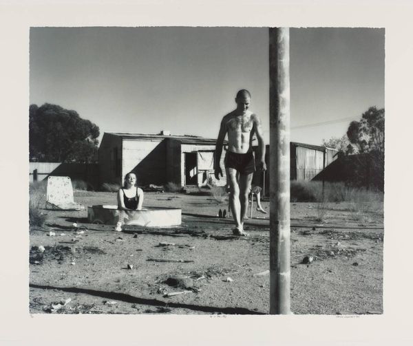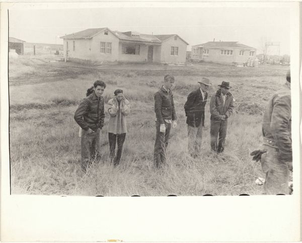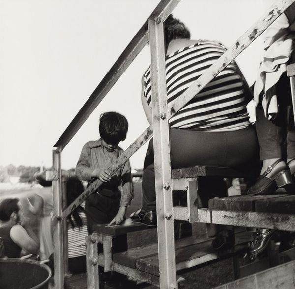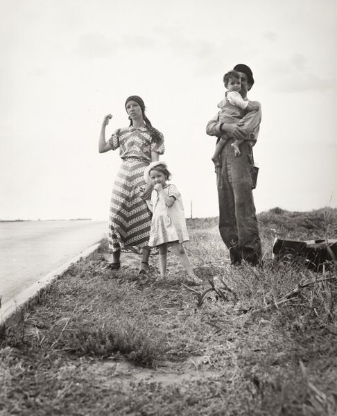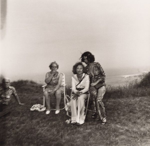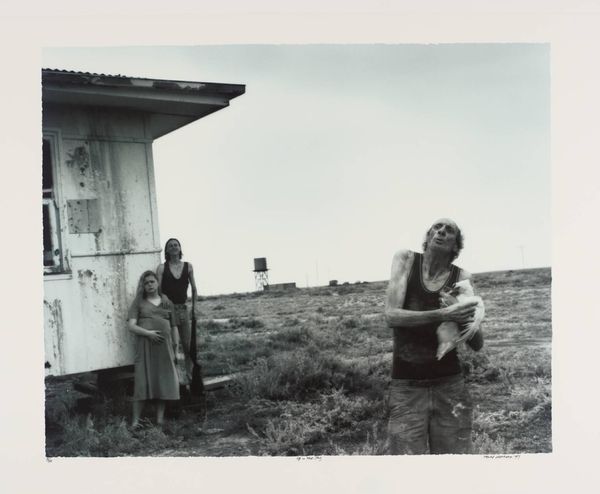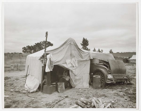 Editor: Here we have Chris Killip’s “Margaret, Rosie, and Val, Seacoal Camp, Lynemouth, Northumberland,” a gelatin silver print from 1983. I’m struck by the bleakness of the landscape, but also the intimacy within the small circle of people around the fire. What do you see in this piece? Curator: This photograph speaks volumes about the socio-economic landscape of Thatcher's Britain. Killip's lens offers us more than just a glimpse; it presents a critical commentary on marginalized communities, specifically seacoal miners, navigating lives impacted by deindustrialization. Do you notice how the figures seem both connected and isolated? Editor: Yes, there's a real sense of camaraderie around the fire, but also a kind of weary distance in their eyes. Curator: Precisely. The stark black and white tones underscore the harsh realities they faced. The wagon in the background, juxtaposed with the temporary structures, also hints at a nomadic existence borne out of economic necessity, challenging conventional notions of home and stability. Think about the ethics of representation here too - how does Killip navigate the power dynamics between photographer and subject? Editor: That's a great point. It makes me wonder about the women's agency in the photograph. Are they subjects of observation, or are they actively participating in defining their narrative? Curator: That’s exactly the question Killip forces us to confront. Consider how gender and class intersect in this image. These women are performing labor, nurturing family, and sustaining community under incredibly difficult conditions. This photograph then becomes an act of resistance, revealing the human cost of policies that often go unseen. Editor: I see it now. It's not just a snapshot of a moment, it’s a layered story about resilience, resistance, and the human spirit in the face of hardship. Thank you for providing the historical background to truly see this artwork! Curator: And thank you for those astute observations. Hopefully, we can encourage other viewers to think critically about whose stories get told, and how.