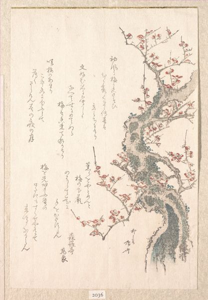 This is a page from the "Ten Bamboo Studio Manual of Painting and Calligraphy" by Hu Zhengyan, crafted during the late Ming Dynasty using ink and color on paper. Notice the arching branch that dominates the composition, moving diagonally across the page, juxtaposing the angularity of the calligraphy with the natural forms. The plum blossoms, rendered in delicate pinks and reds, punctuate the somber tones of the aged branch. Look at how the artist plays with negative space, allowing the paper’s pale surface to define the form and texture. This use of space and color isn't merely decorative. The Manual served as a guide, codifying techniques. As a visual language with structured signs, each element carries symbolic weight. The plum blossom symbolizes resilience and renewal and intersects with broader philosophical themes of the cyclical nature of time and being. Consider how these elements work together: line, color, and space. They reflect a structured approach to art, that also resonates with historical and cultural values. This artwork invites us to explore the ongoing dialogue between tradition and innovation.