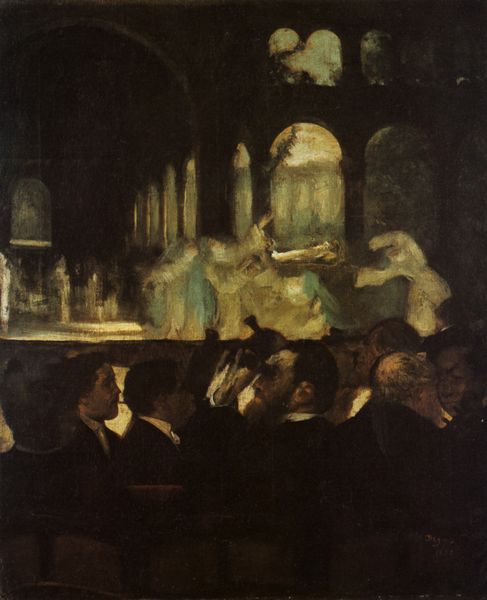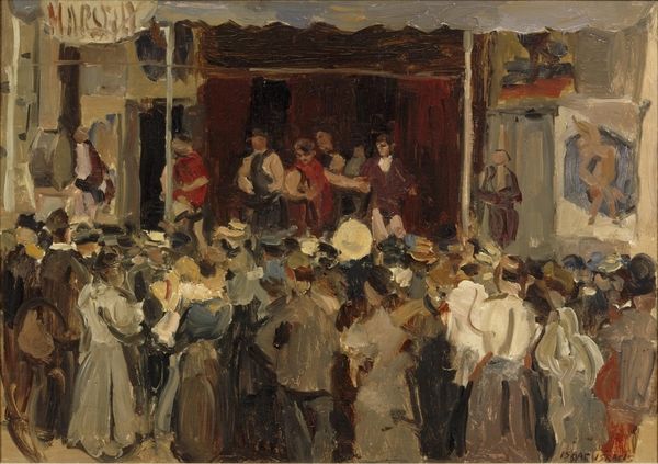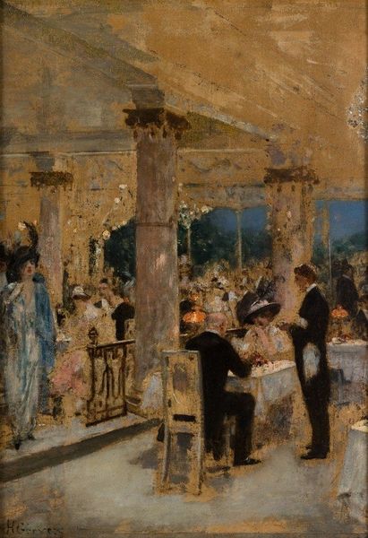 Editor: This is Giovanni Boldini's "Feast Scene," painted around 1889. It's a really dynamic piece, a swirl of figures in what appears to be an upscale gathering. The frenetic energy almost feels like it's spilling off the canvas. What can you tell me about it? Curator: Looking at this, I see a fascinating document of late 19th-century social life rendered through the lens of production. Boldini’s loose, almost frantic brushwork, wasn’t just about capturing a fleeting moment; it was a deliberate choice, influenced by the rapidly changing industrial landscape. How do you think the availability of new pigments and materials impacted the vibrancy of the scene? Editor: I guess those new materials would have allowed him to be bolder and more experimental? Curator: Exactly! And it wasn't just about color. Consider the ready-made canvases and the rise of the art market. This work becomes a commodity, reflecting a culture increasingly obsessed with leisure and spectacle. It depicts, in its very materiality, the values of its time. Think about the patrons consuming this image – what class are they a part of? Editor: Well, they must have been fairly wealthy. Curator: Precisely! How does this impact your view on the artwork and how we interpret what Boldini attempts to represent? Editor: I hadn’t considered the economic context of its production and consumption before. Now it makes sense that this depicts an event meant to show off wealth in the rapidly modernizing world. Curator: It is important to acknowledge these things and see them when analysing pieces from the time periods when the industry around materials truly started expanding. Editor: I see how the art isn't just about what's depicted, but the entire social and economic system surrounding its creation. Thanks for pointing out those material aspects; they completely changed how I view this "Feast Scene."