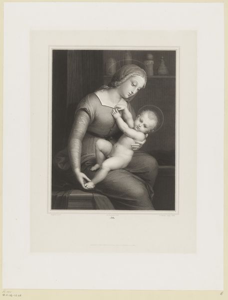 Achille Désiré Lefèvre created this mezzotint print, "Maria met Kind," in the 19th century. Its iconography is traditional: the Virgin Mary and the infant Jesus. Images like this one can tell us a lot about the social values of the time. The figure of Mary has been culturally important for centuries, she embodies motherhood, purity, and compassion. In 19th-century Europe, the rise of bourgeois culture led to an increased emphasis on domesticity and family values. Images of the Holy Family reinforced these ideals, promoting a particular vision of the family unit. The image creates meaning through visual codes: Mary’s modest dress and gentle expression convey humility and virtue, reinforcing her role as a moral example. The tenderness and nurturing in the image reflect cultural ideals of motherhood. By studying the print and the historical context in which it was made, we can gain a deeper understanding of the social and cultural values that shaped its creation. This kind of research, using sources from the period, is essential if we are to grasp the complex relationship between art and society.