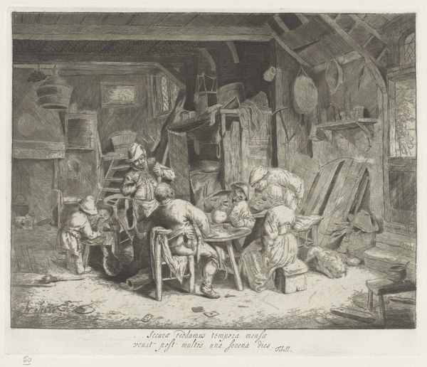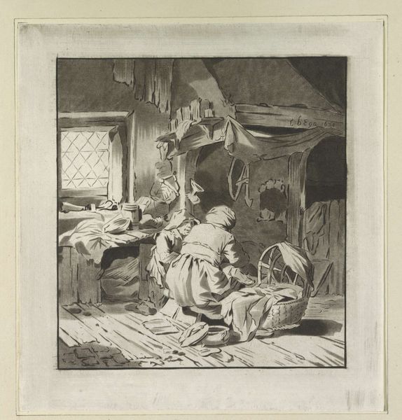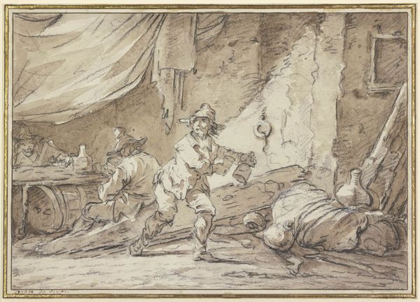 Curator: Let's turn our attention to Hubert Robert's "Interior of a Farmhouse with Figures," created around the late 18th century. This work employs ink and watercolor on paper to capture a scene of everyday rural life. Editor: It feels intimate, almost claustrophobic. The subdued palette emphasizes the rough textures of the farmhouse interior. Note how the light is articulated, emanating softly from the doorway and fireplace. Curator: Exactly. The composition leads our eye through a chain of human labor – observe the woman cooking, the figure working at the doorway, the other presumably completing her toilette in the space above the staircase. Robert offers us insight into the organization of labor within the household. It's also an inventory of objects of labour that might have also served as signifiers of status or wealth: those hanging copper pots, that woolen dress hanging from a beam... Editor: Those are all relevant semiotic registers, aren’t they? This isn't just documentation, though. Robert arranges these figures in a way that balances light and shadow, creating a harmony, or perhaps a formal choreography of form. Consider the contrast between the soft roundness of the figures and the sharp lines of the architecture. Curator: I agree. Consider also how the fireplace and open door almost 'bookend' the tableau and contribute to the composition; but how is this image mediated? As a drawing, Robert represents what, for all intents and purposes, is likely to be very dark in actuality and lacking any sense of color. The materials matter too, because what this scene actually captures is a shift: away from agriculture towards artisan manufacture, as well as from regionalism toward Paris as the center of design. Robert is as much a recorder as he is an arbiter of design! Editor: Absolutely, that translation is a fundamental component. The drawing highlights line and shape and directs our understanding as opposed to just reproducing "reality". He simplifies, he edits and highlights certain features over others to guide our interpretations. And he emphasizes a particular feeling--intimacy perhaps, as I suggested--that draws on certain elements. The formal choices are intentional and invite consideration in this representation of late-eighteenth century labor. Curator: It provides an accessible yet captivating view into the means of survival and cultural shifts of 18th-century France, seen from inside the literal working process. Editor: Yes. Focusing on its structure allows us to see how much Robert infused the functional with feeling.