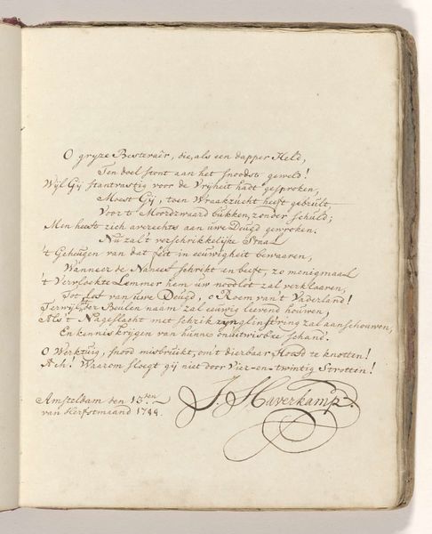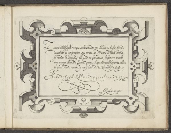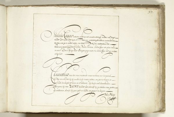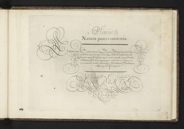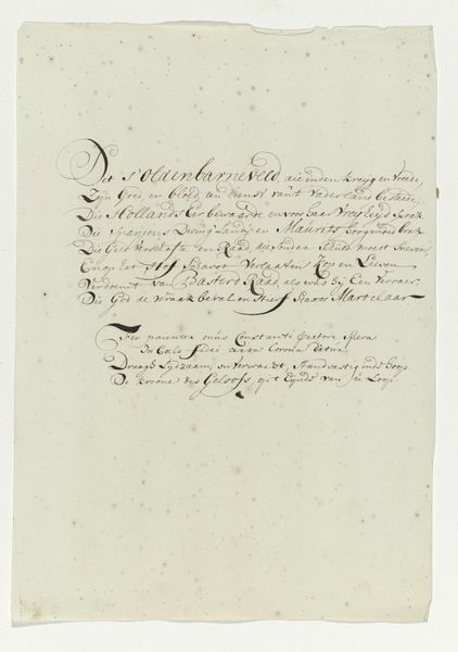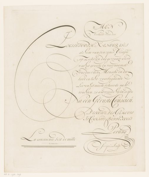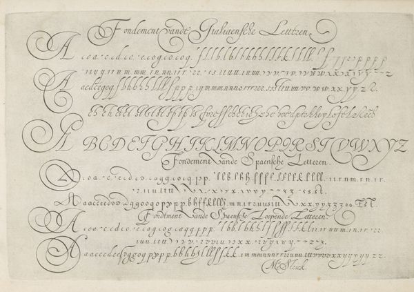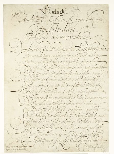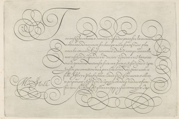 Editor: So, this is Nicolaas Muys' "Demonstratie van schoonschrijfkunst," or "Demonstration of Calligraphy," from 1671. It’s a drawing in ink on paper. I’m struck by the contrast between the formality of the calligraphy and the almost playful, whimsical flourishes. What do you make of it? Curator: This is fascinating. Calligraphy, at this time, was far more than just penmanship; it was a powerful cultural symbol. Notice how the script seems almost to dance across the page? What does that evoke for you? Editor: I guess it feels both precise and expressive at the same time. It reminds me of formal dances. Curator: Exactly. It carries echoes of ritual, doesn't it? The flourishes and the letterforms all speak to the symbolic importance of order, balance, and beauty within 17th-century Dutch society. Calligraphy was considered an art form, laden with meaning. How does the act of writing itself feature in this piece, separate from its semantic content? Editor: I suppose the act of demonstration implies knowledge being passed down or performed for others, like a display of skill and erudition. It isn’t just about what is written but how the text is made. Curator: Precisely. The cultural memory embedded within the strokes and forms. Do you see hints of personal or professional identity conveyed here, not just information, within these characters? Editor: It’s made me rethink calligraphy, no longer just as writing, but as a form of cultural expression. The skill and mastery it represents, and its place within its time. Curator: Agreed. The image of writing gains further meaning.